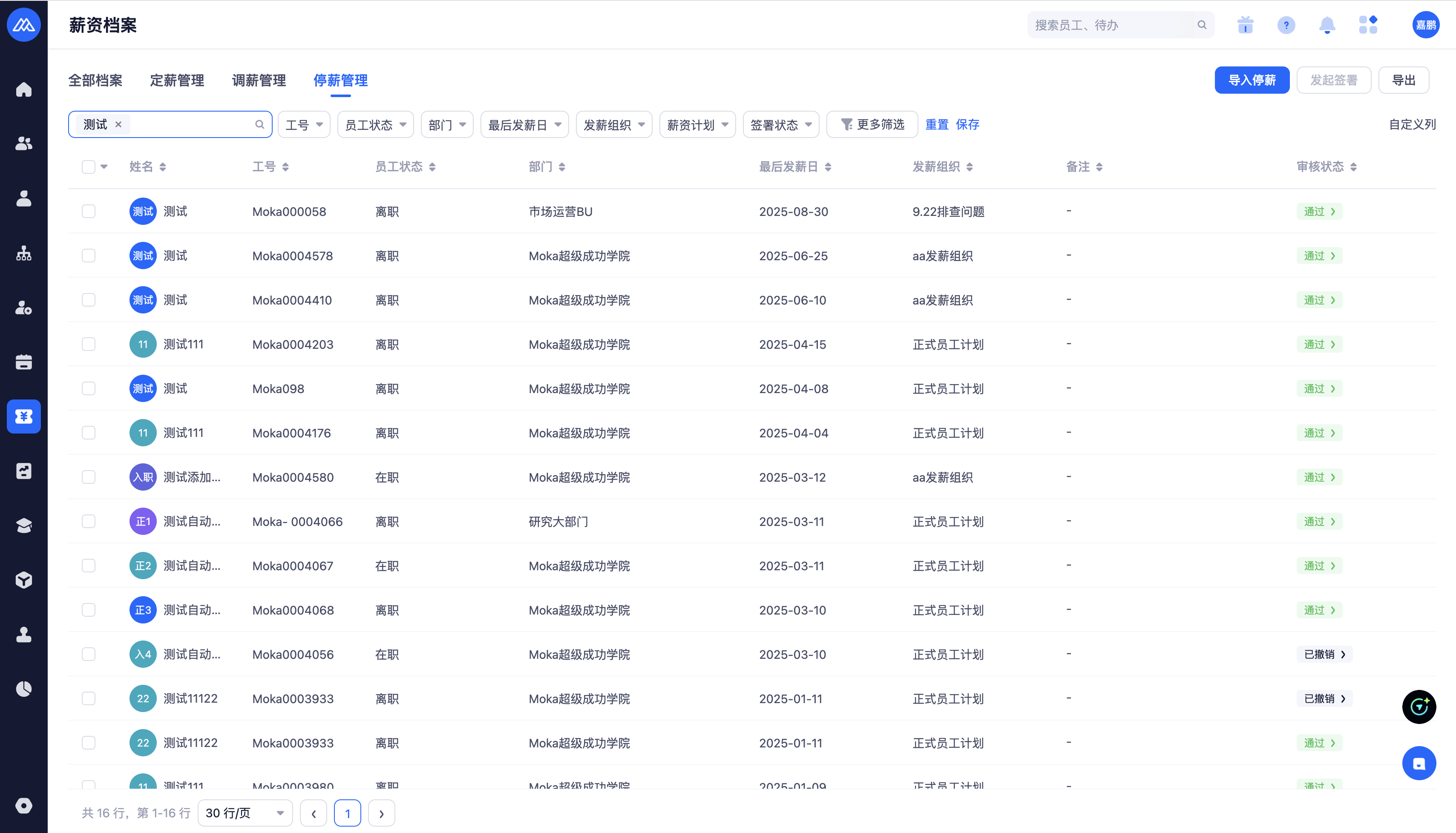 权限控制:会根据当前登录用户的停薪人员功能所对应的管理范围,匹配员工所属发薪组织