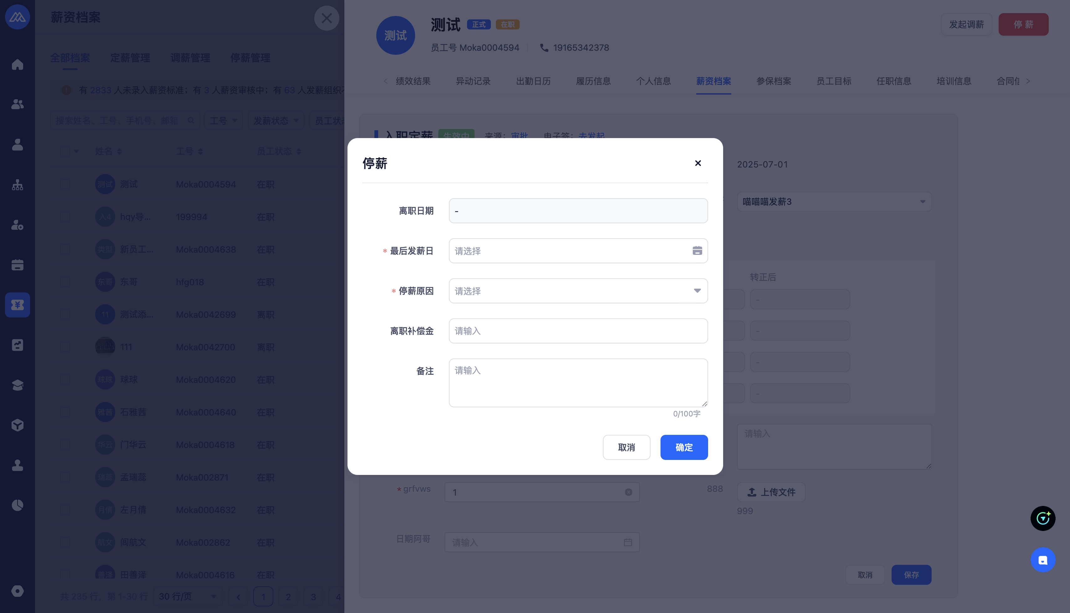 停薪业务发起⽀持薪酬档案发起,以及和离职业务关联申请;