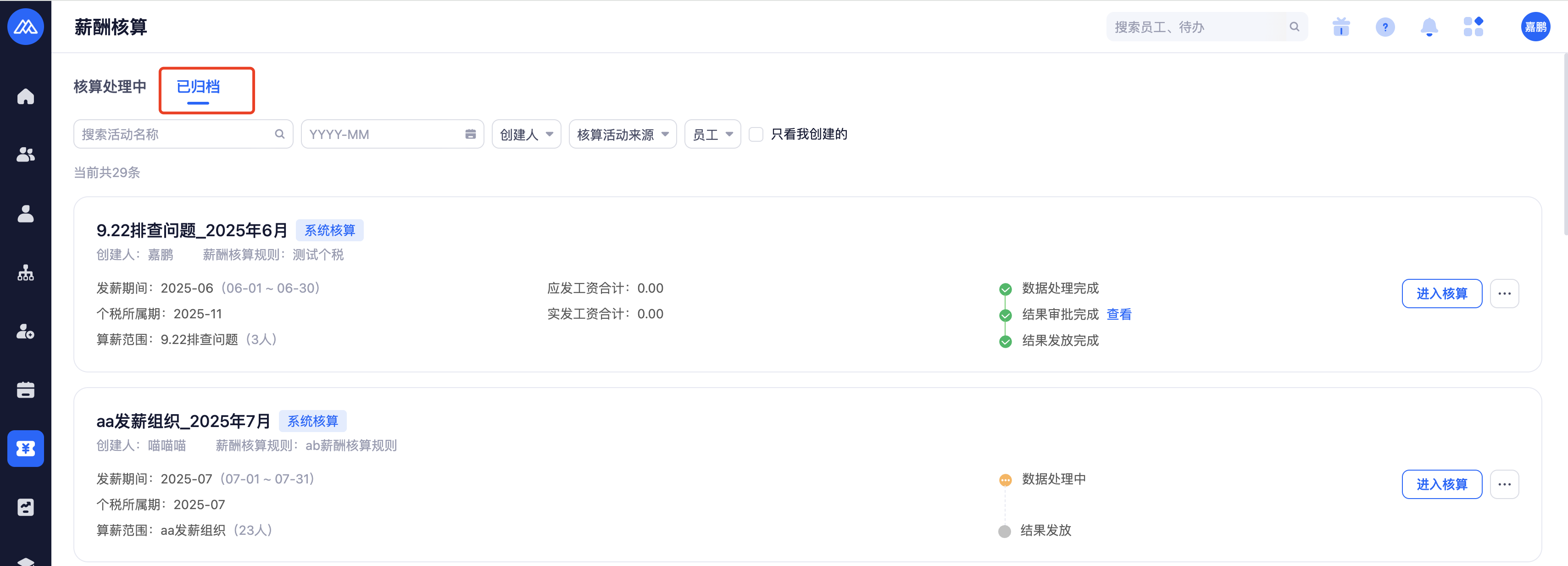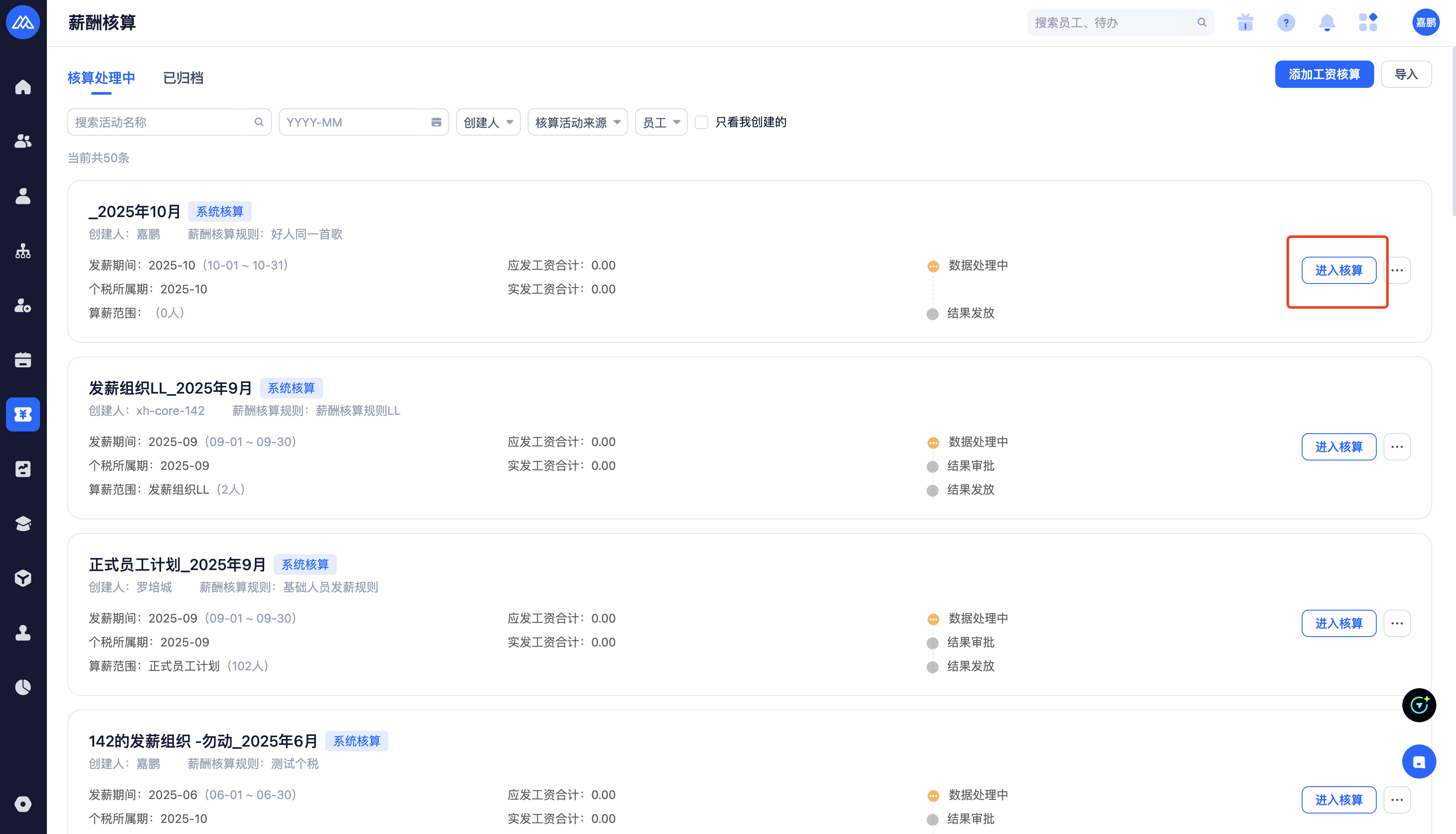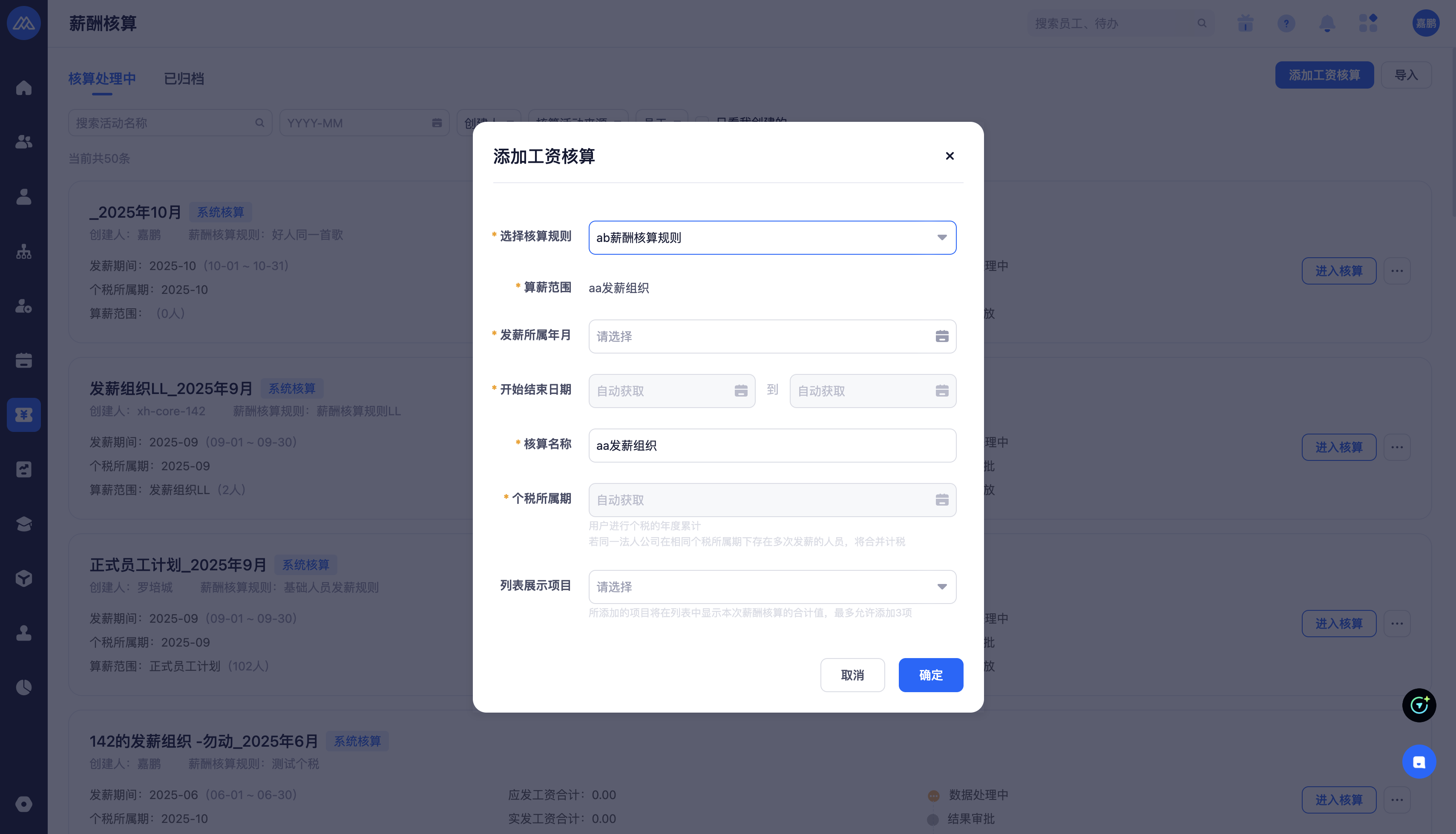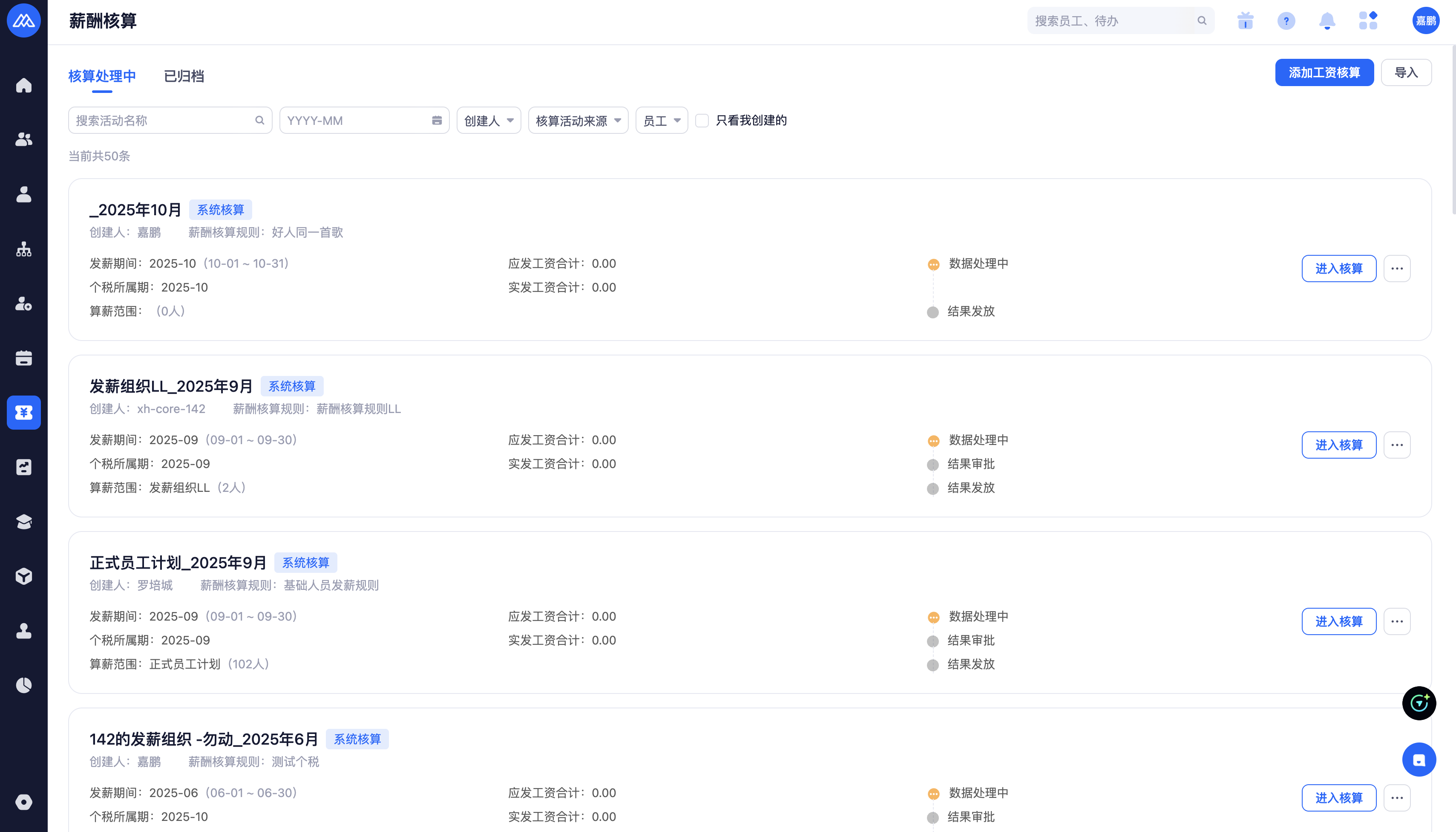 支持设置发放周期,后续在周期内的核算活动都会自动同步该人员