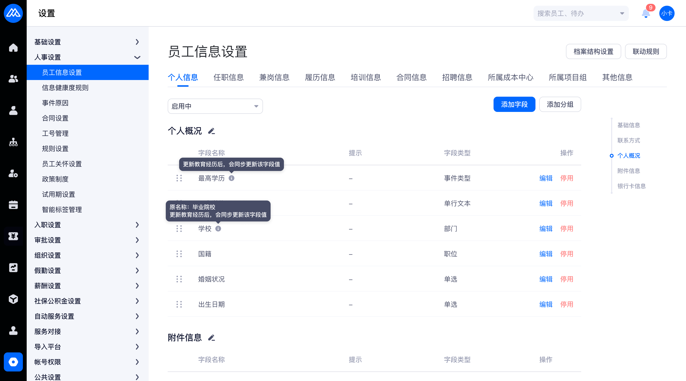 在系统中更新员工的【履历信息 - 教育经历】时,同步更新【个人信息 - 个人概况】中以下几个字段,会在字段设置中提醒