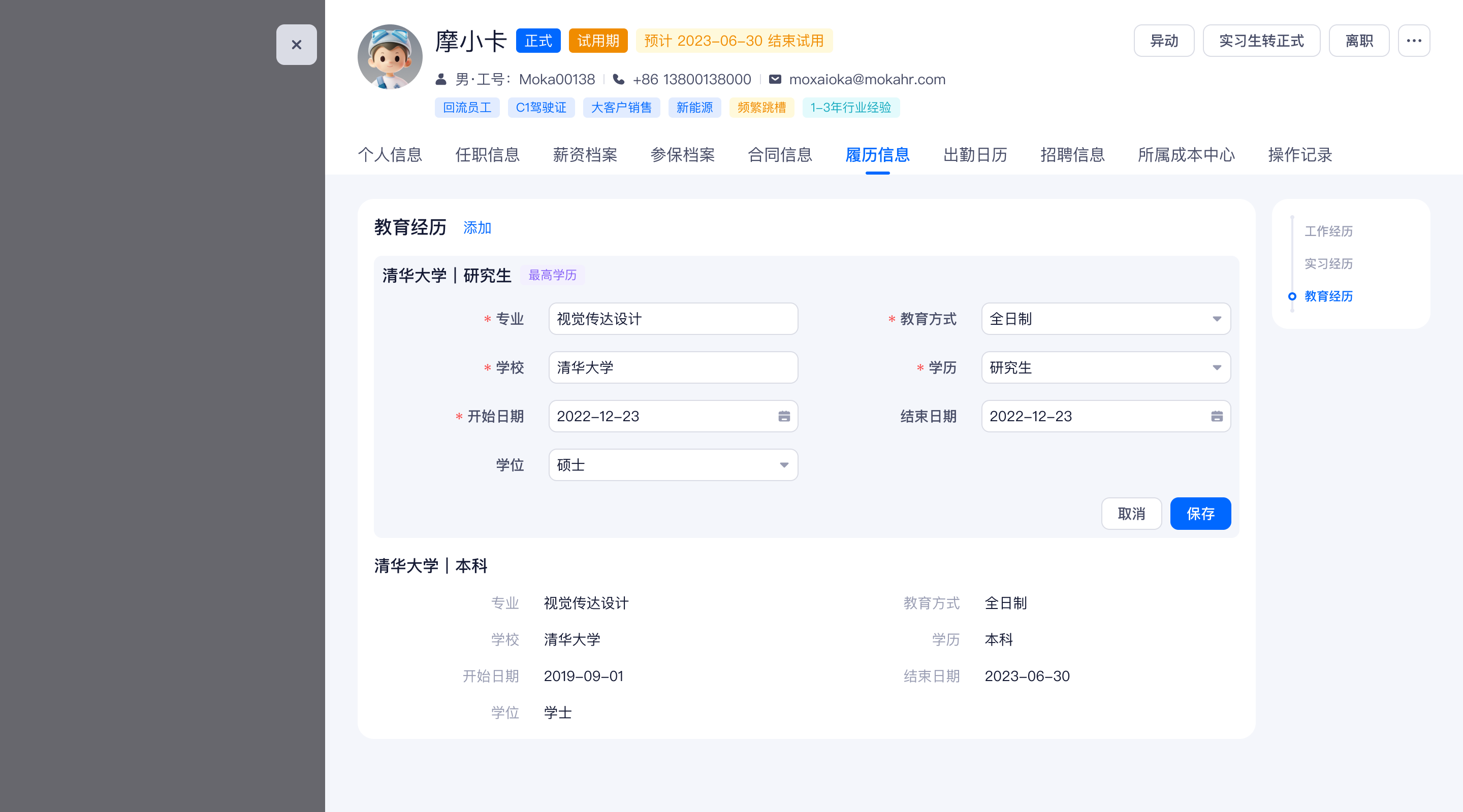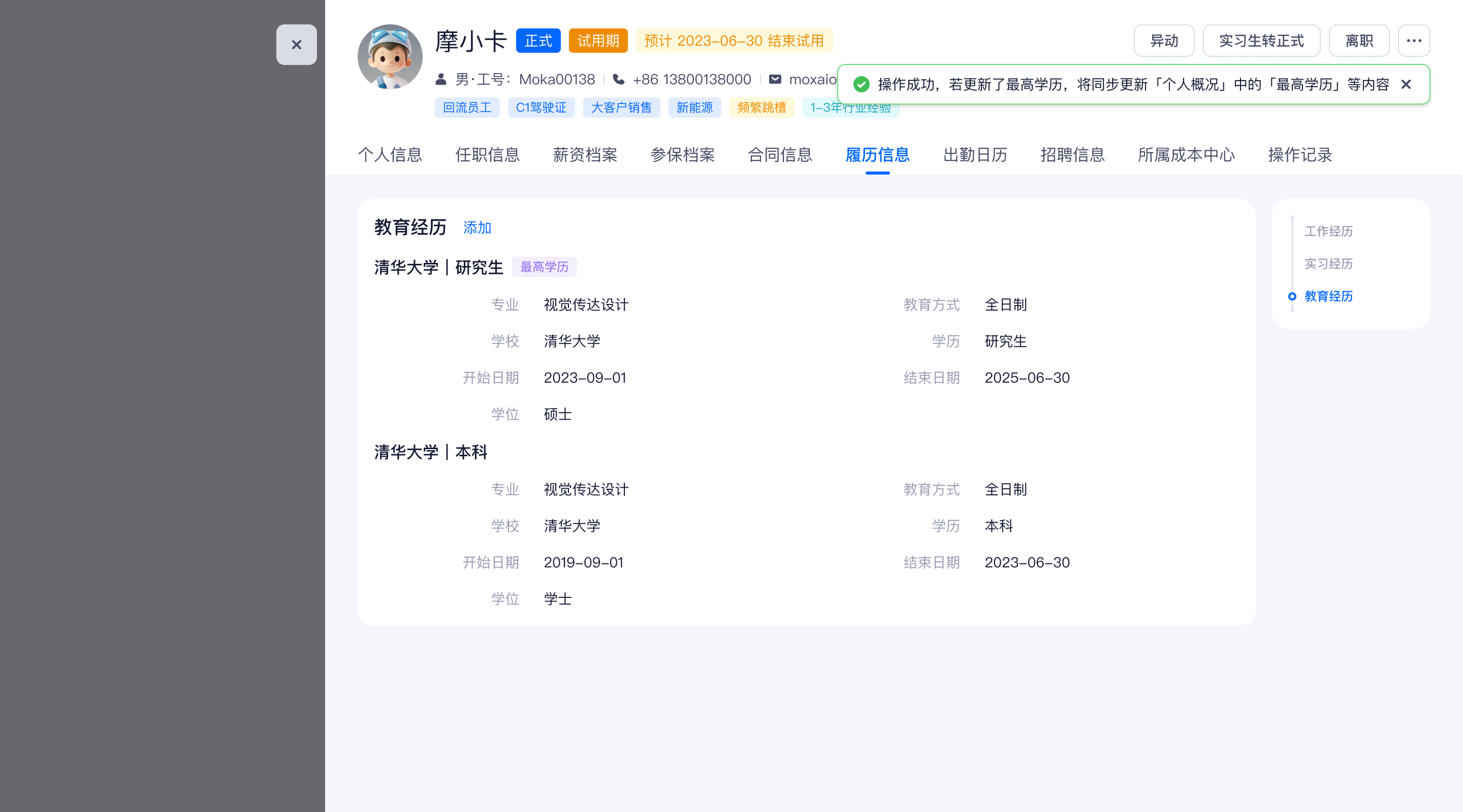 当前在花名册中编辑「教育经历」后,「个人信息」中的「最高学历」「毕业学校」等字段不会联动更新,导致 HR 需要再手动更新