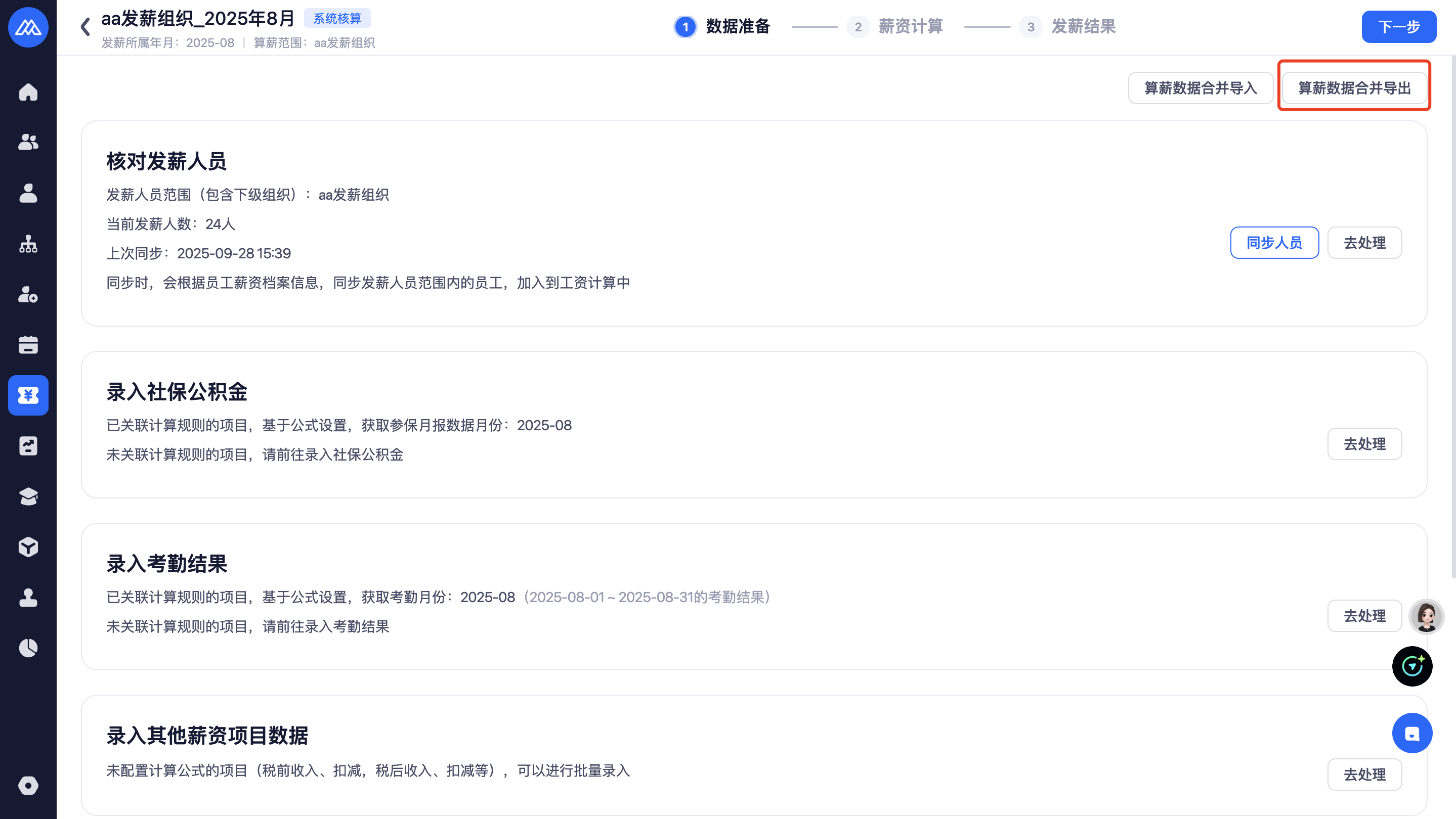 算薪数据合并导出:之前有薪酬核算活动查看权限的用户默认开启 |