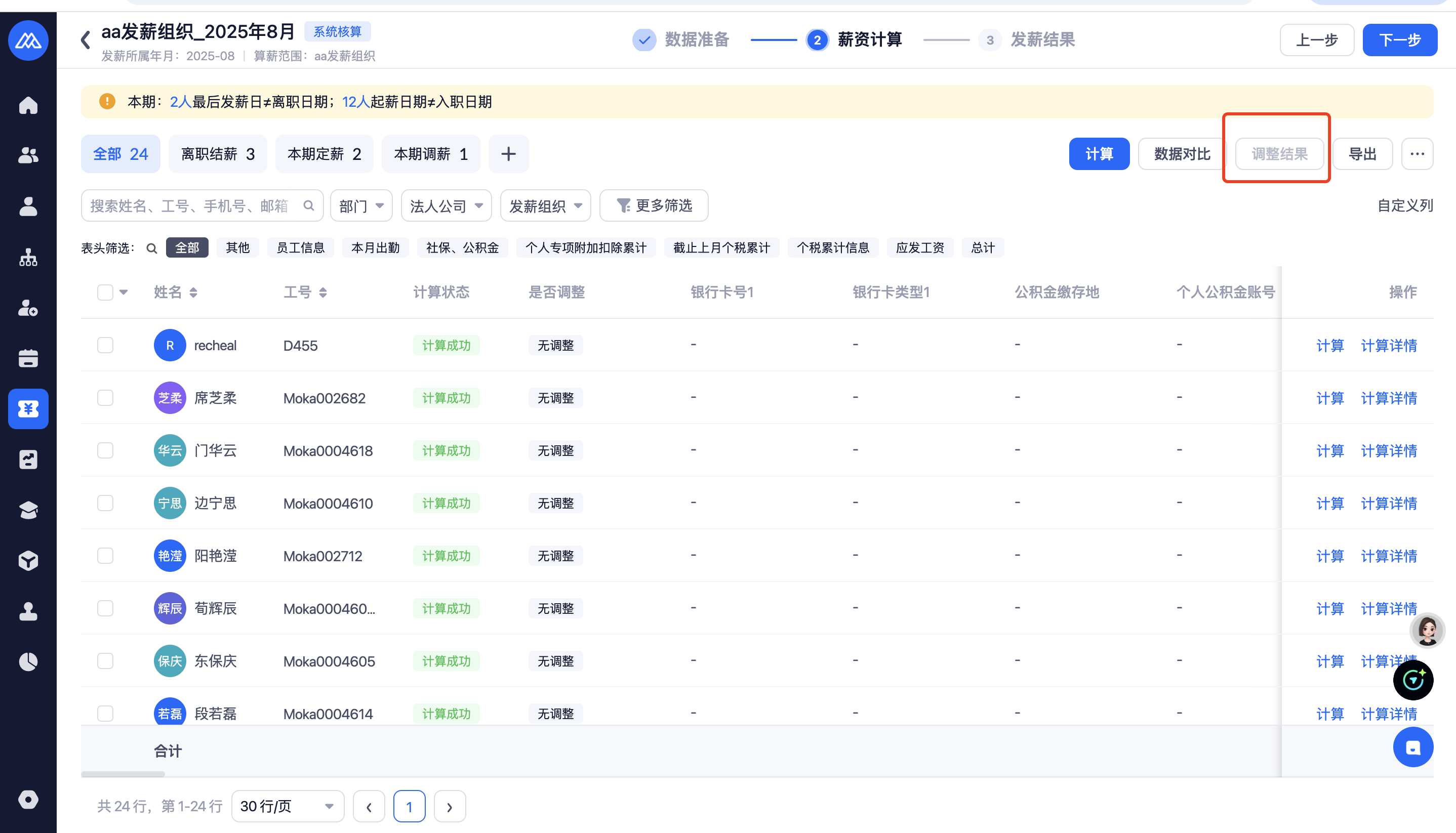 在【设置-账号权限-角色管理】薪酬核算的权限控制中增加了调整结果和导出相关的权限控制