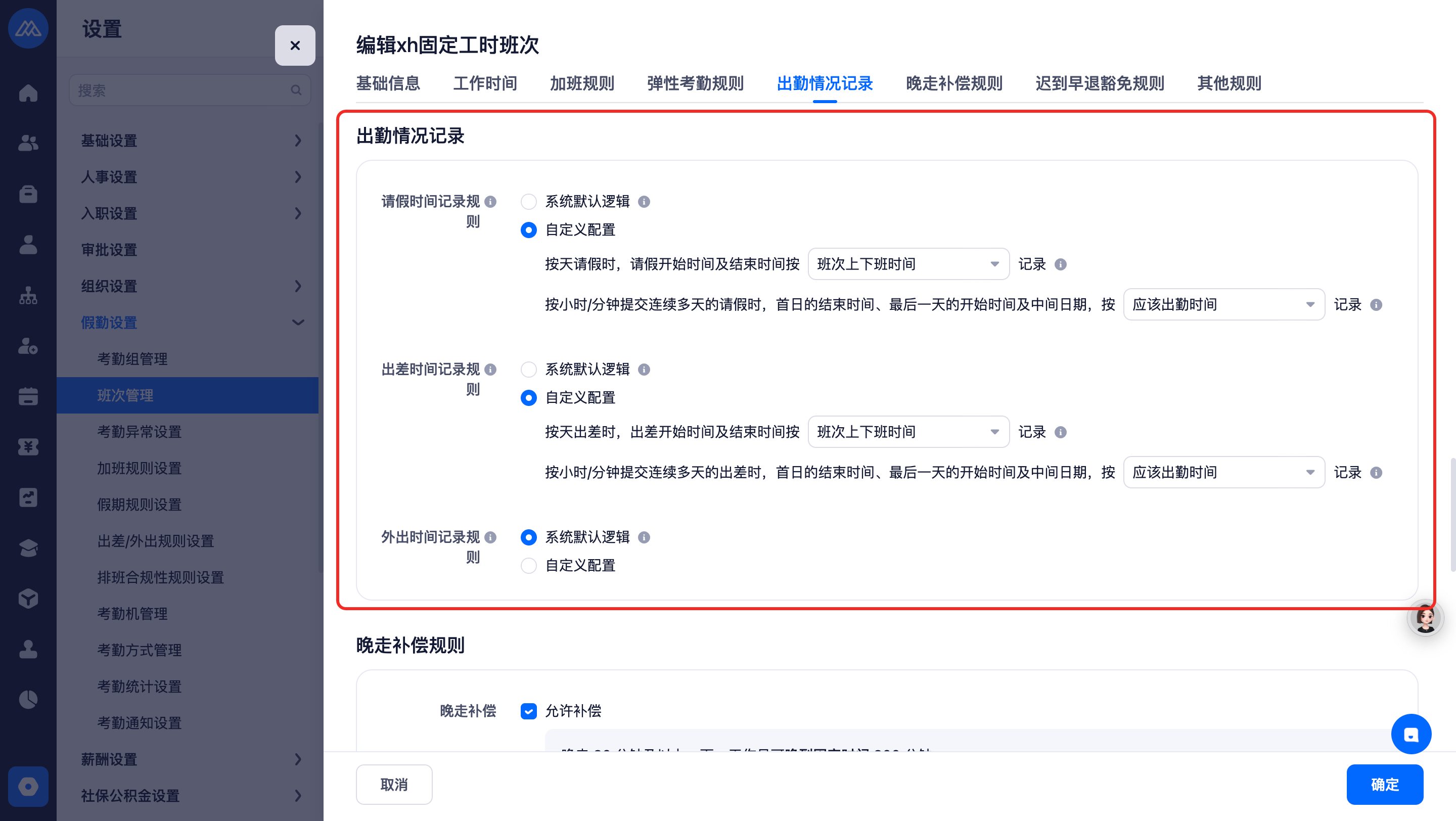 班次管理中增加「出勤情况记录」的配置,位置在弹性考勤规则后