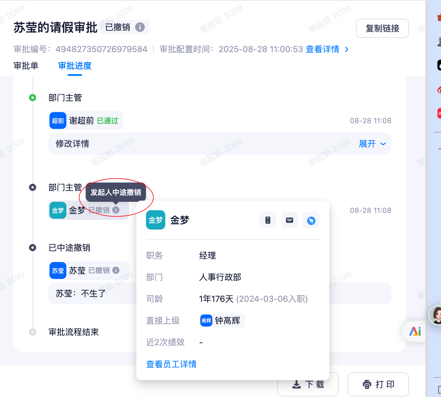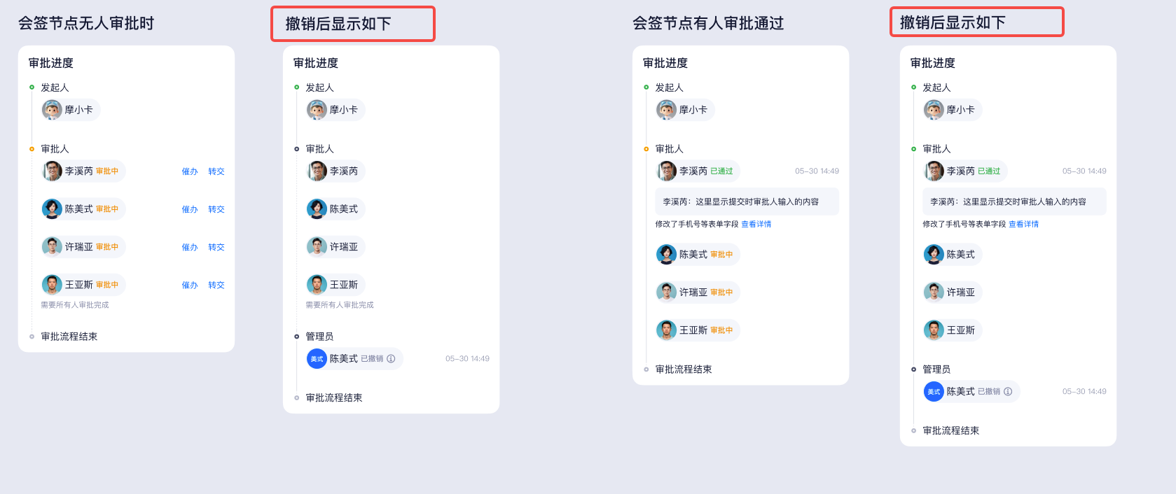 审批单中途被审批人撤回后,目前逻辑将新增一个末端节点「已中途撤销」以及同时在当前审批人节点展示「已撤销」。导致审批管理员以及相关人查阅时,第一直觉以为是当前审批人进行的撤销