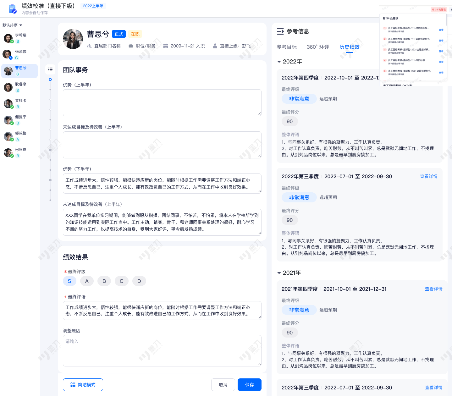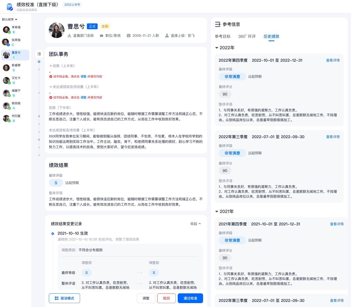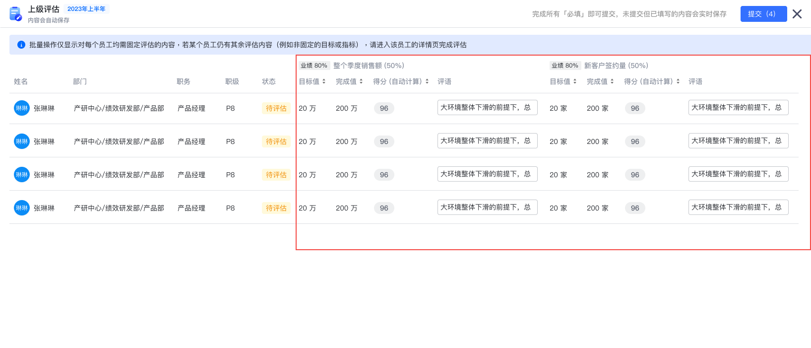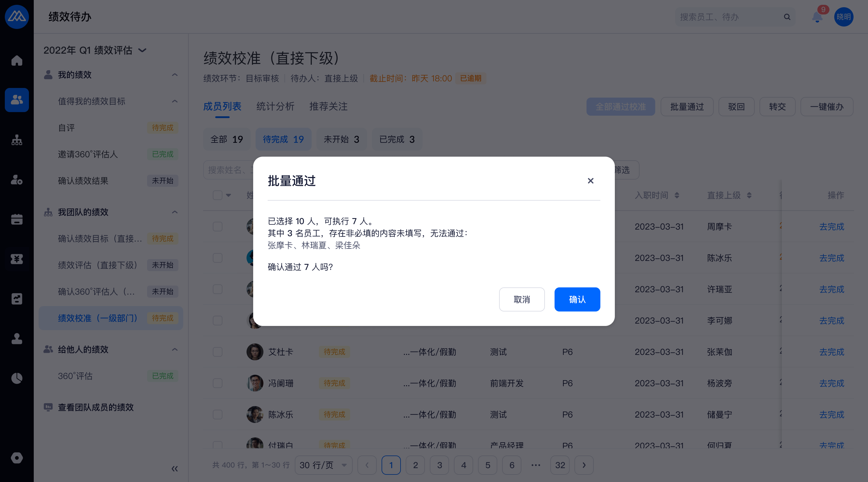 在列表入口操作批量通过时,若通过的被评估人含有未填写的必填字段,则批量通过时无法通过这些被评估人,并在批量操作的 double check 弹窗中新增提示,如下图红框: