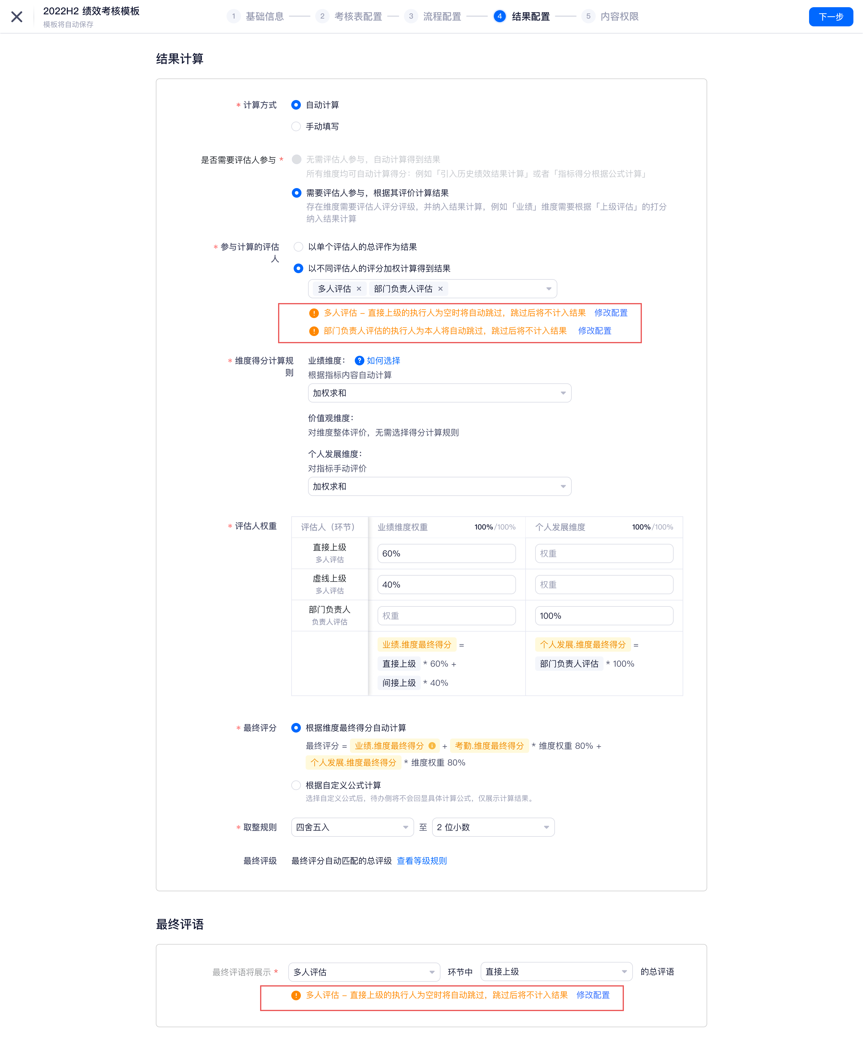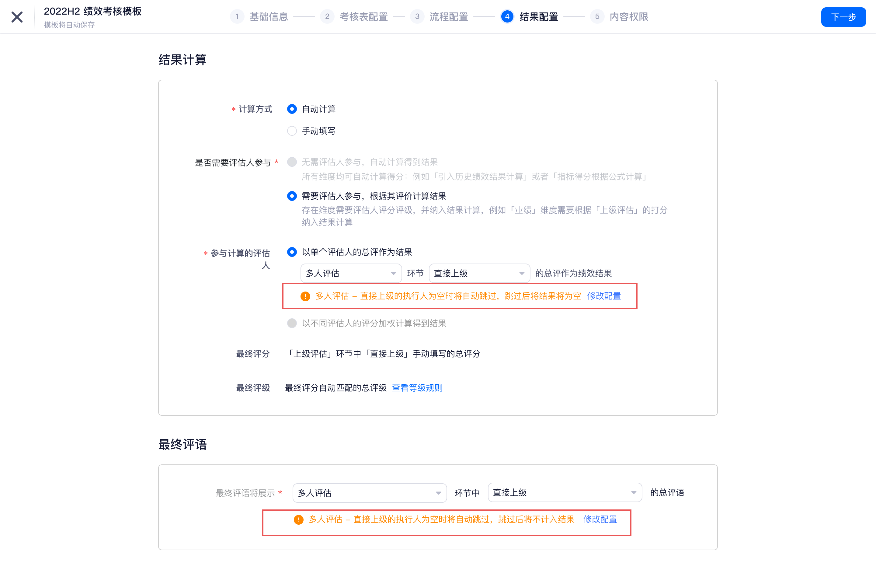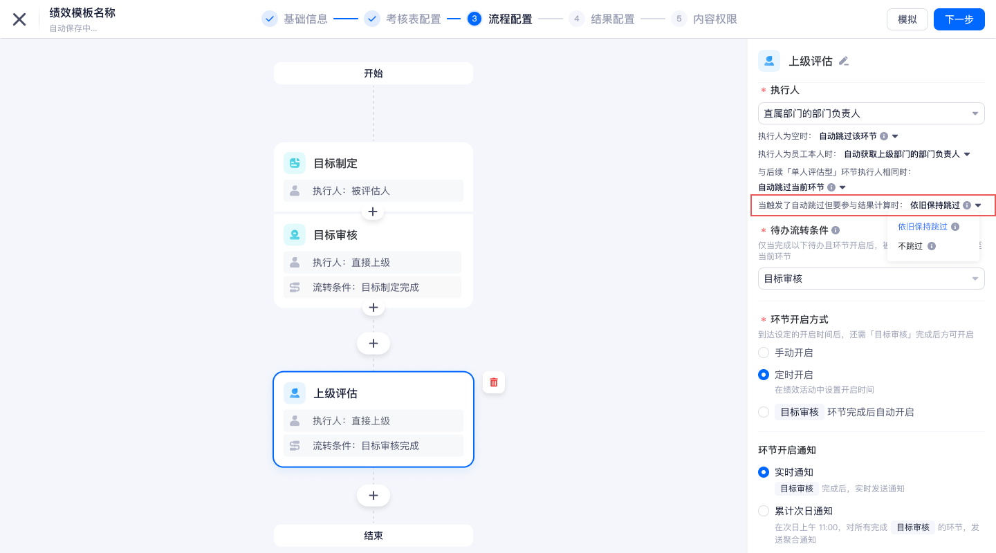 当参与结果计算的环节配置了「依旧保持跳过」时,在第四步结果计算进行提示