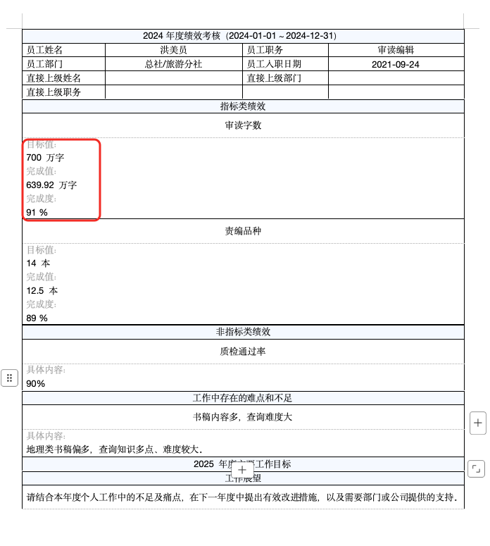 当前导出单人的绩效详情的 Word 用于线下打印,样式有以下问题导致 HR 需要手动调整,效率低下: