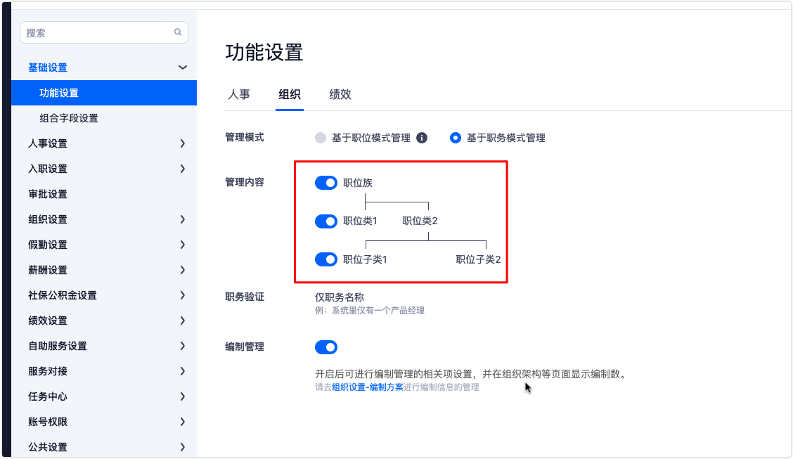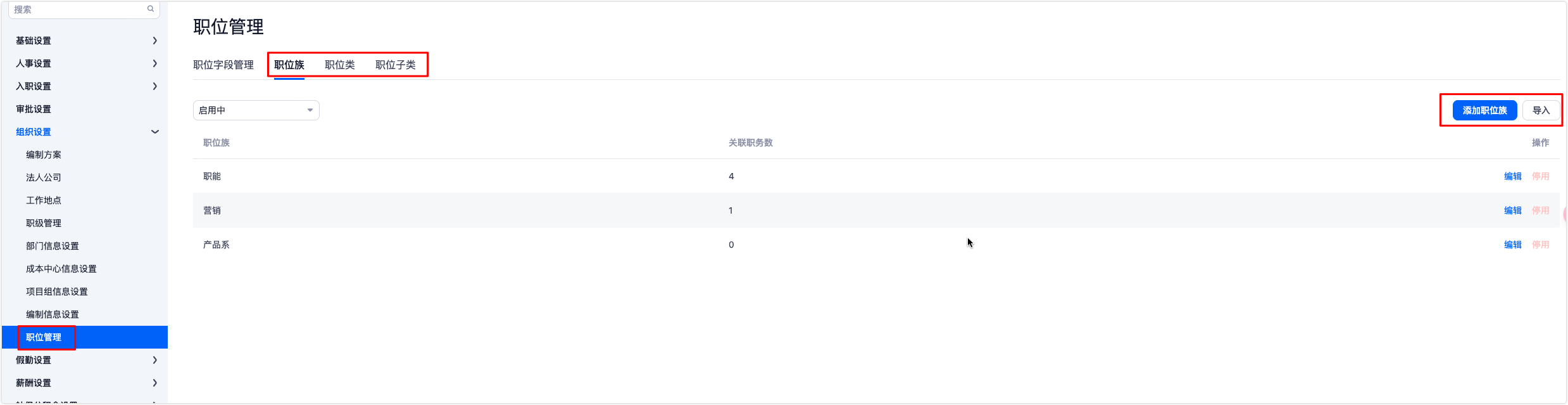 如需要对职务进行多级分类,按需启用职位族-职位类-职位子类