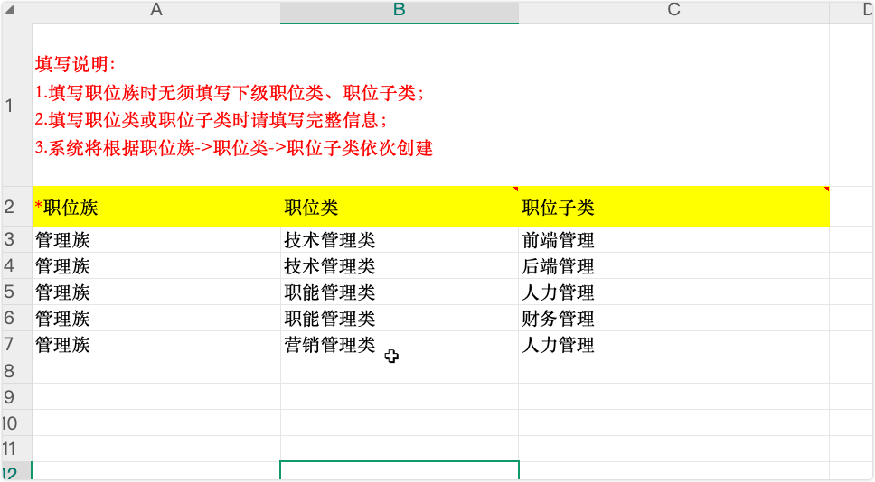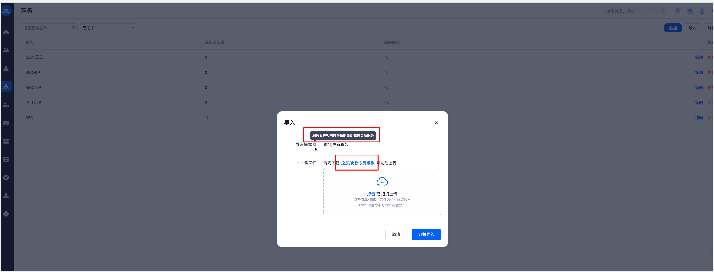 职务数据可通过导入模板批量导入新增、更新(职务名称相同则更新)。路径如下: