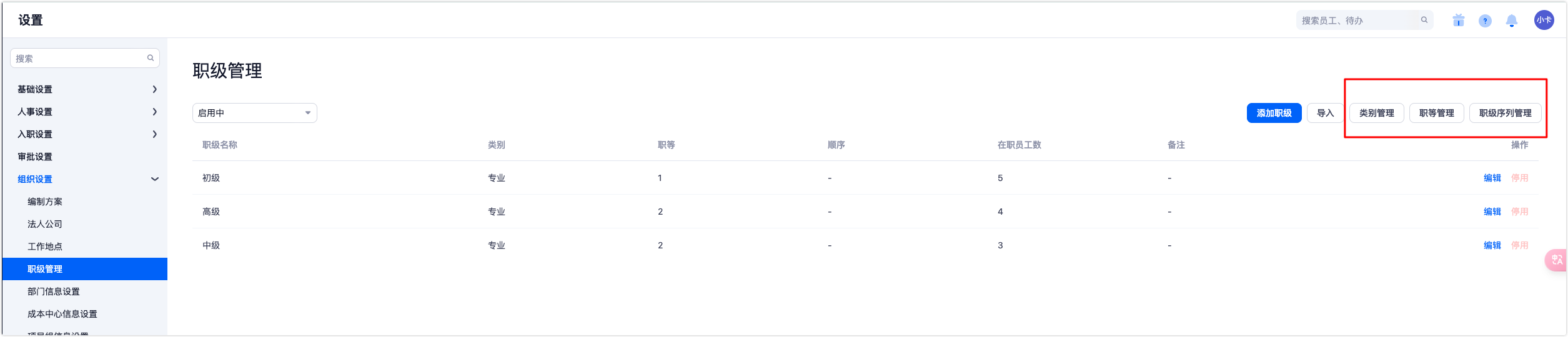 路径:设置-组织设置-职级管理,按需定义职级相关配置
