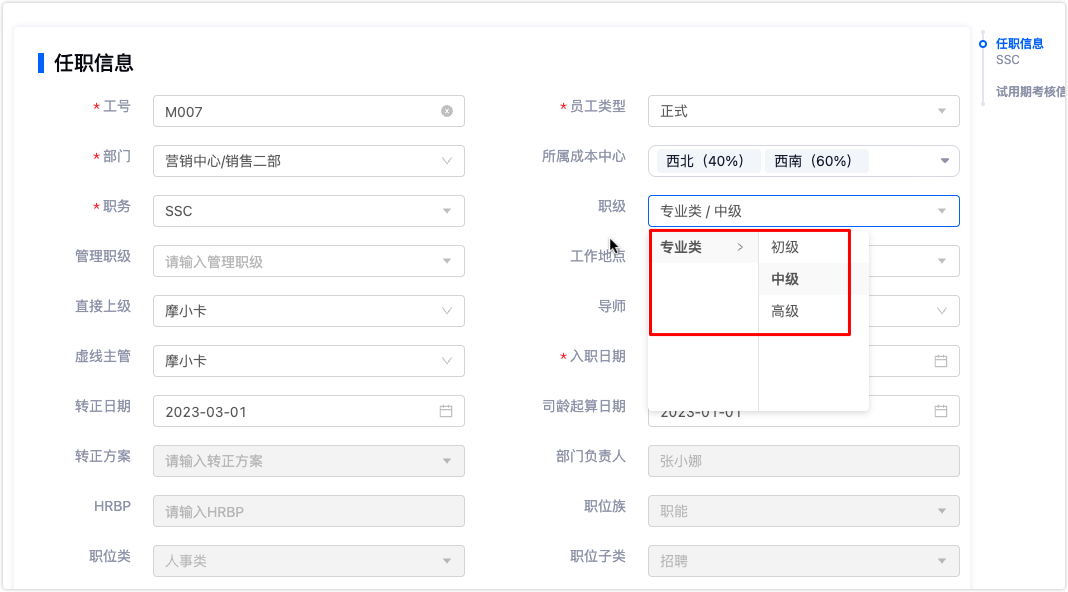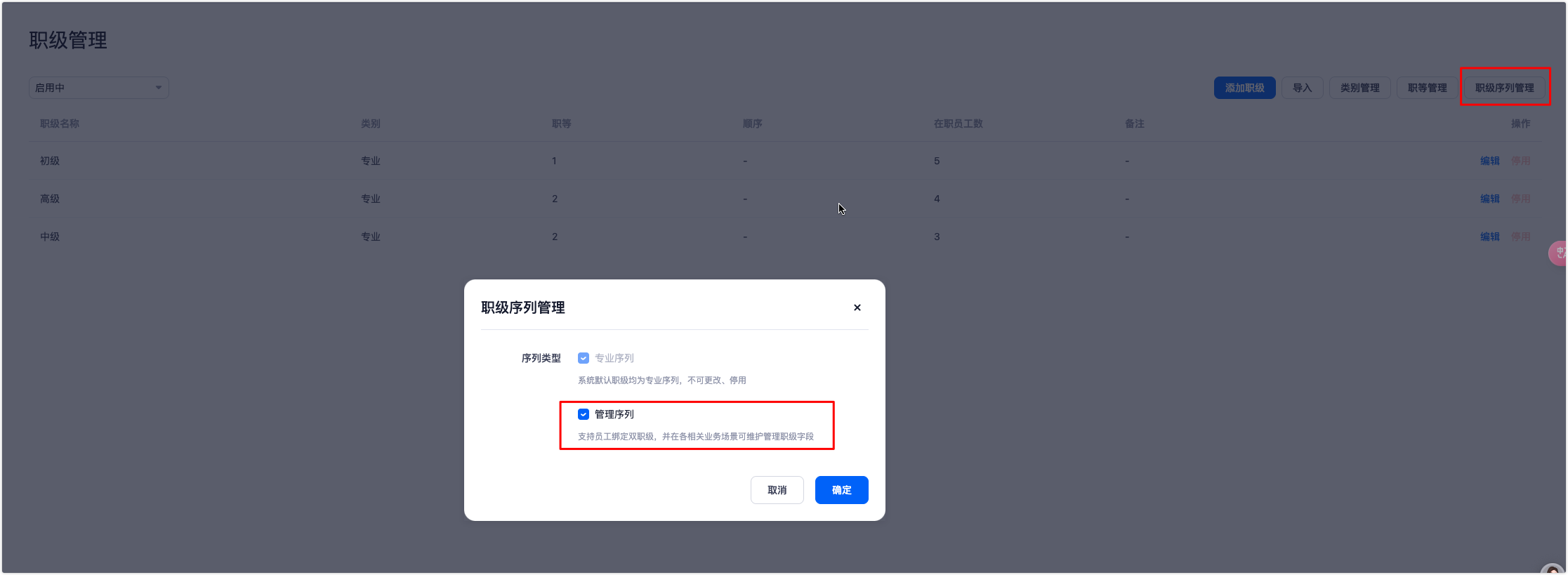 职级序列:系统支持一个人同时存在 2 个职级,如存在此业务,需要开启双职级开关