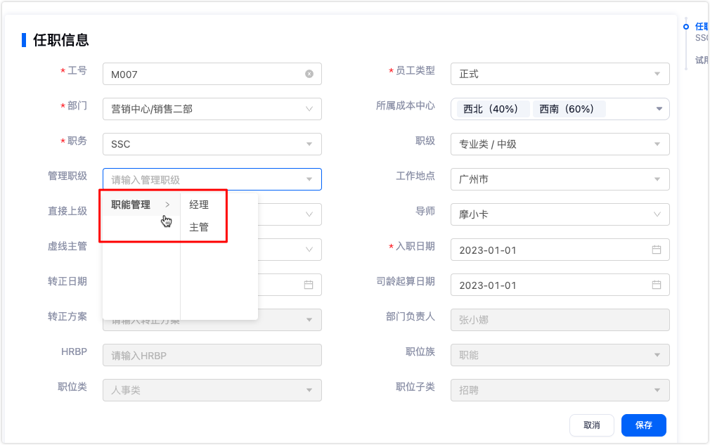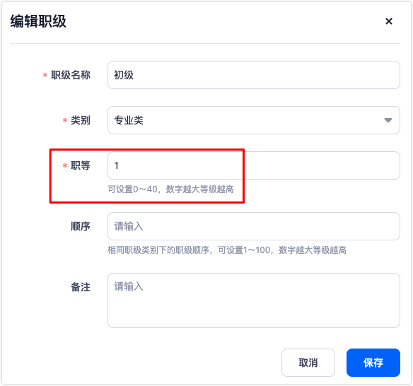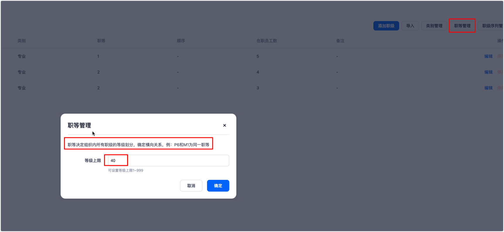 职等管理:每个职级之间可以有等级大小之分,如 P7的职等与 M1 职等相同,享有同等薪酬待遇。用户可自定义企业内最大职等