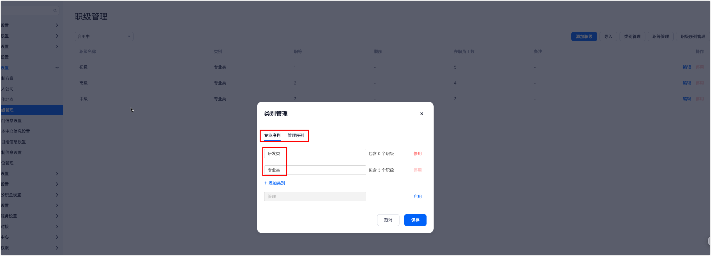 类别管理:每个序列(专业、管理)的职级可以定义不同的类别以实现职级信息精细化管理。