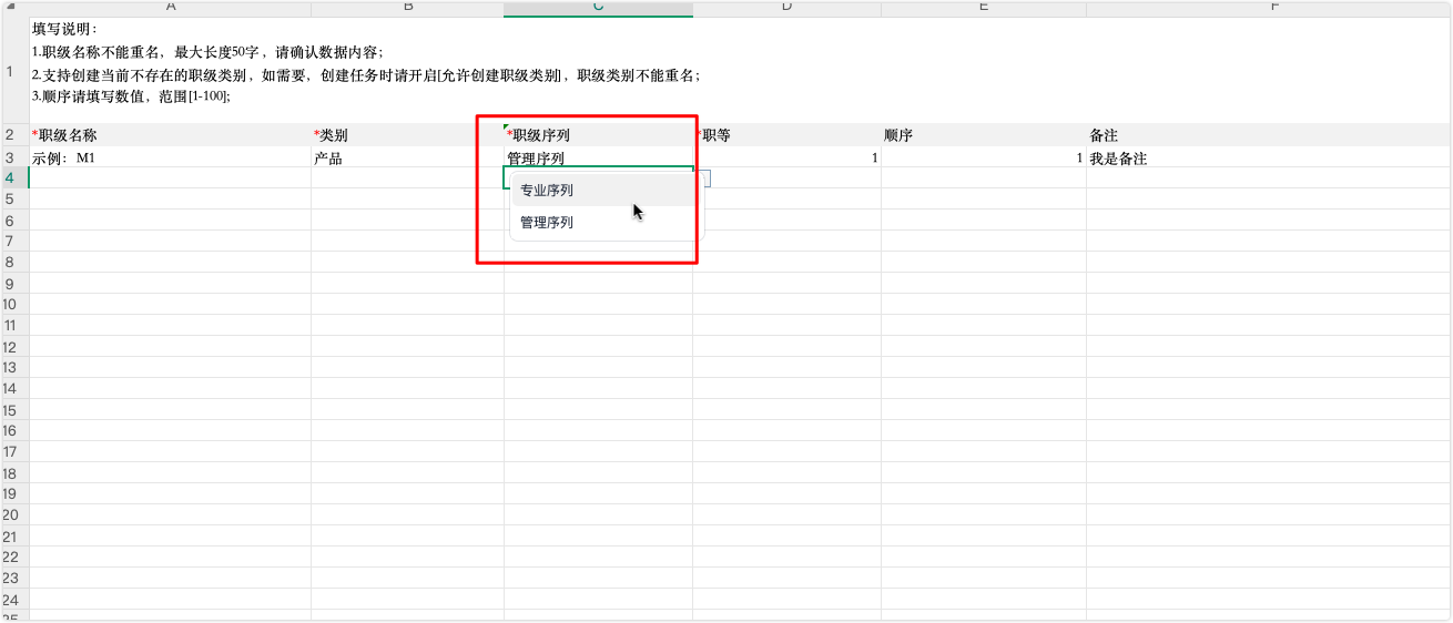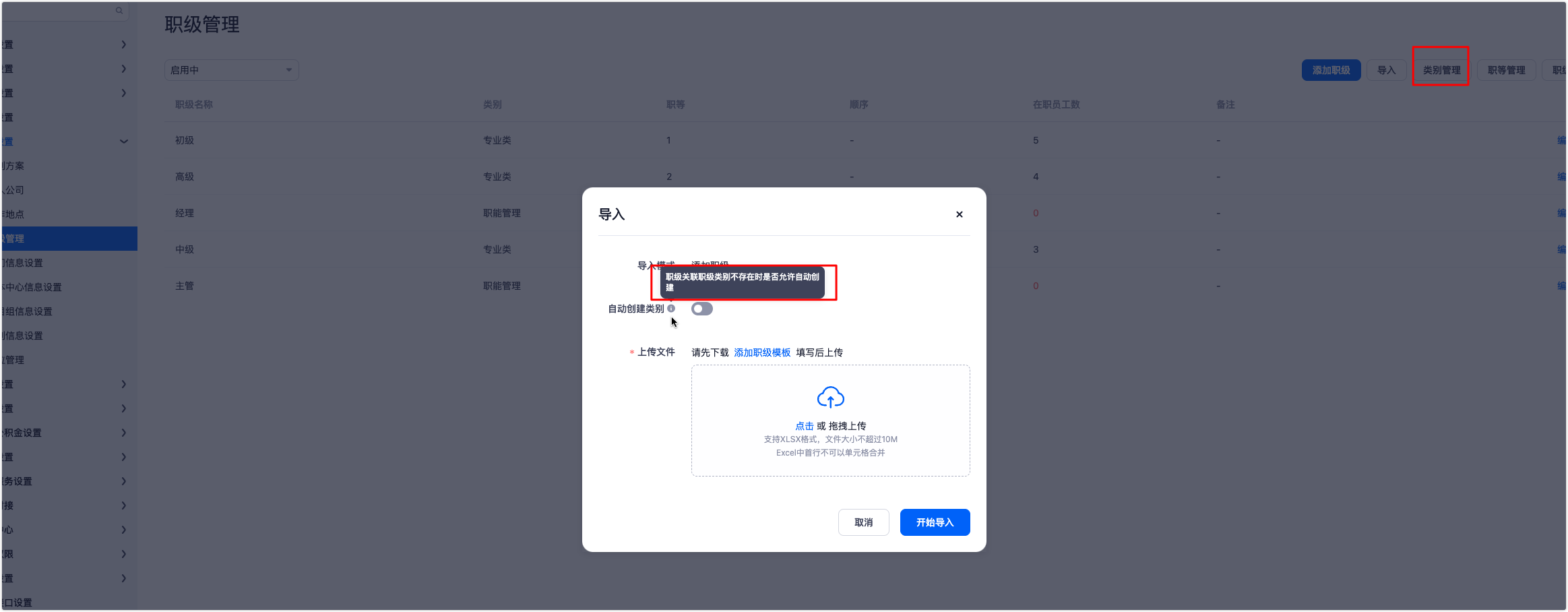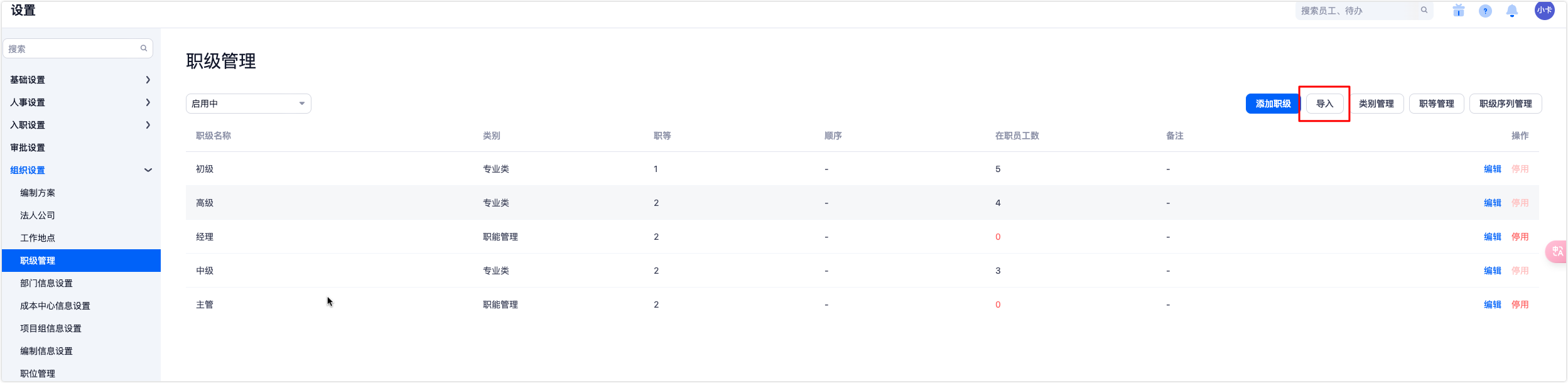 职级支持在批量导入,路径:设置-组织设置-职级管理;注意:若是单职级客户,在导入表格中 C 列 职级序列字段请选择专业序列
