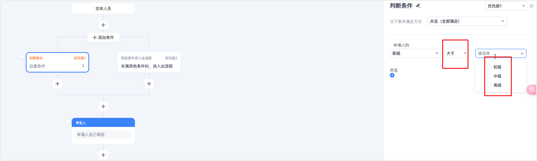 A:审批流程支持按职等设置分支判断条件,如 5 职等以上走 CEO 审批。5 职等可能有 10 个职级,无需一个一个勾选职级。