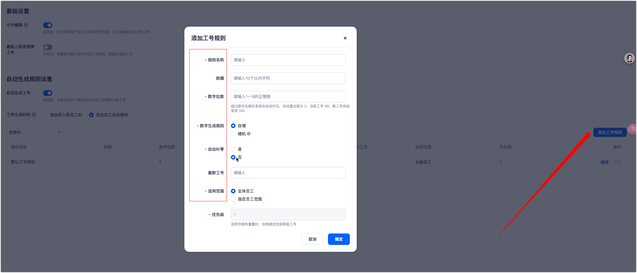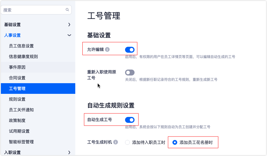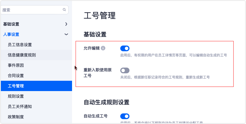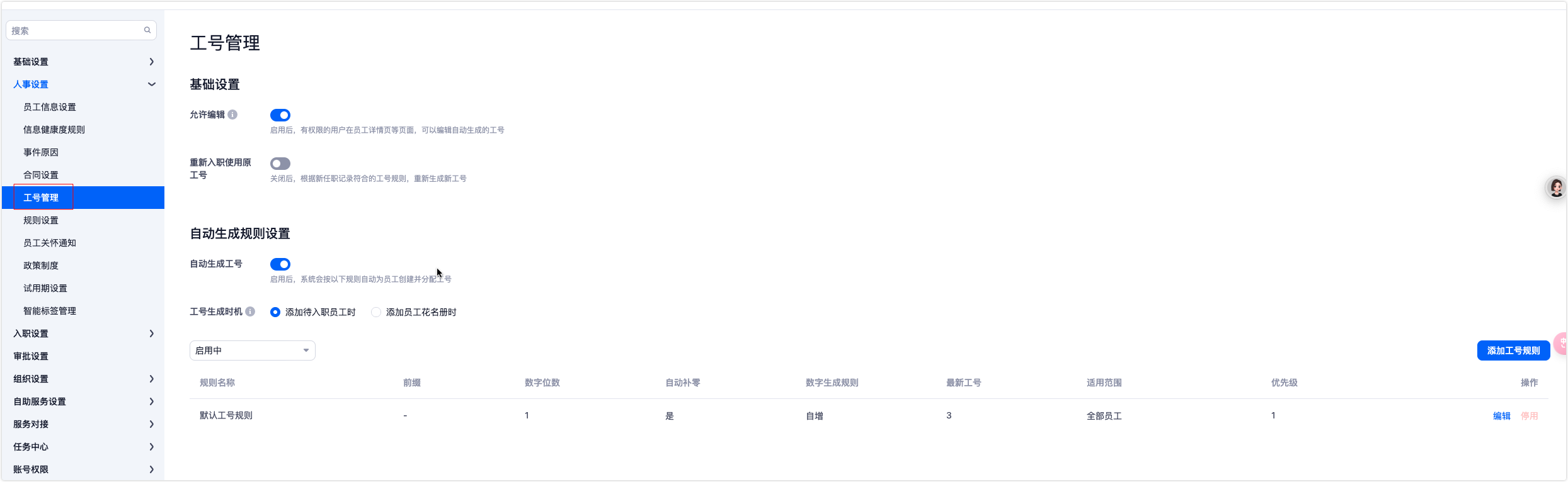 工号可以设置是否允许用户编辑,一般建议开启,保留容错。二次入职的员工可以按需选择是否使用原工号。