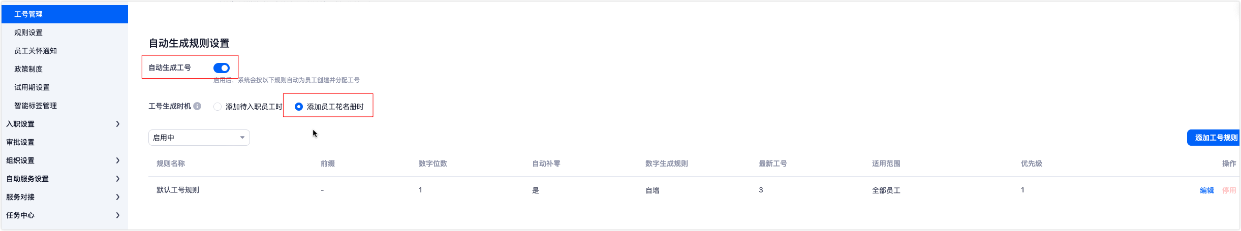 工号如果需要通过系统自动生成,则需要开启下图“自动生成工号”选项,推荐工号的生成时机是:添加员工花名册时。避免取消入职人员占用工号导致工号不连续。