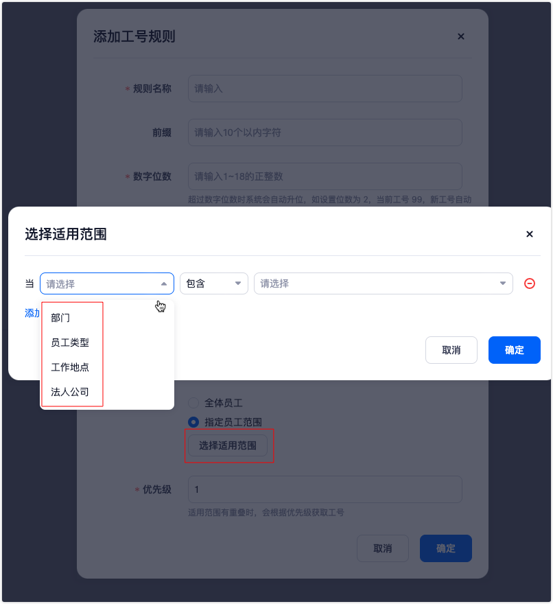 系统支持多套工号规则逻辑,如A公司用A+5位数字流水号,B公司用B+5位数字流水号。当前支持按照部门、员工类型、工作地点、法人公司四种维度进行设置。