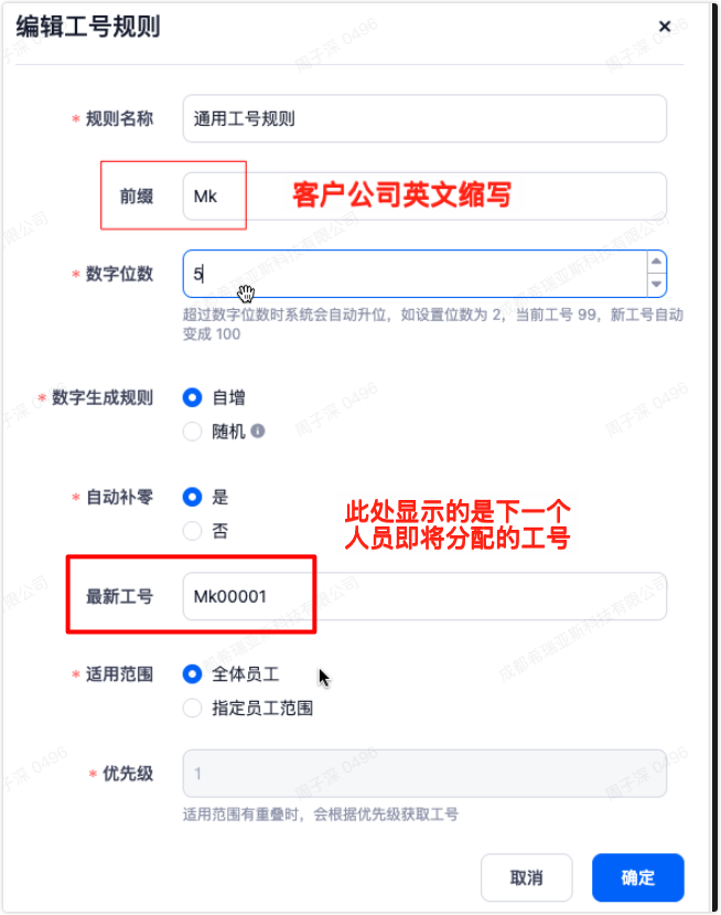 通用工号规则:前缀建议用客户公司英文名前缀,如MOKA,MK。若无特殊要求,适用范围设置为全员即可。(Tips:最新工号指的是下一个即将被分配的工号)
