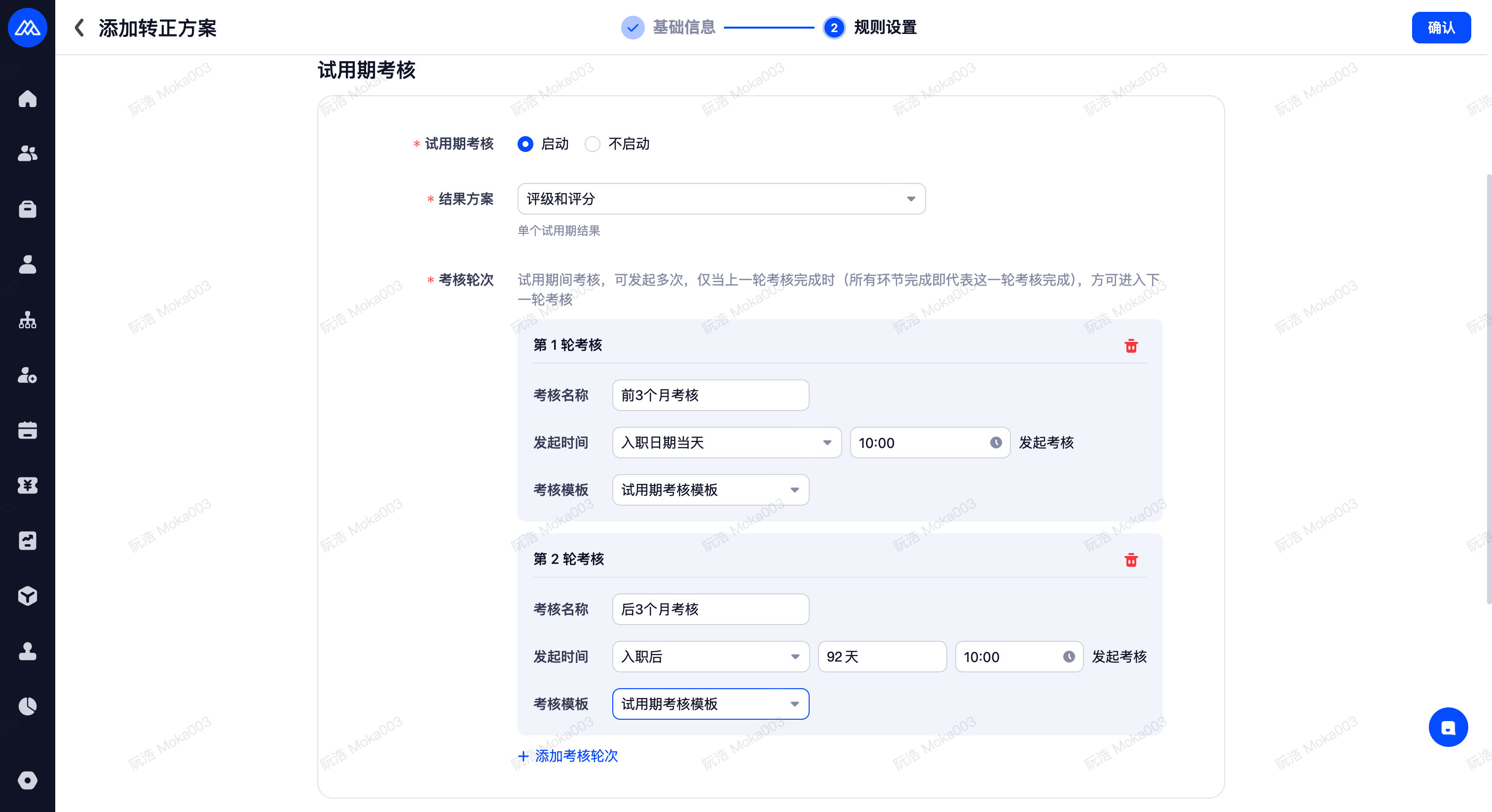 设置试用期考核轮次:有些公司在员工试用期期间不是只做全周期的总体考核,而是按月度或者按季度进行多轮的试用期考核。可通过在转正方案设置试用期考核轮次,来实现试用期多轮考核的业务场景,如下