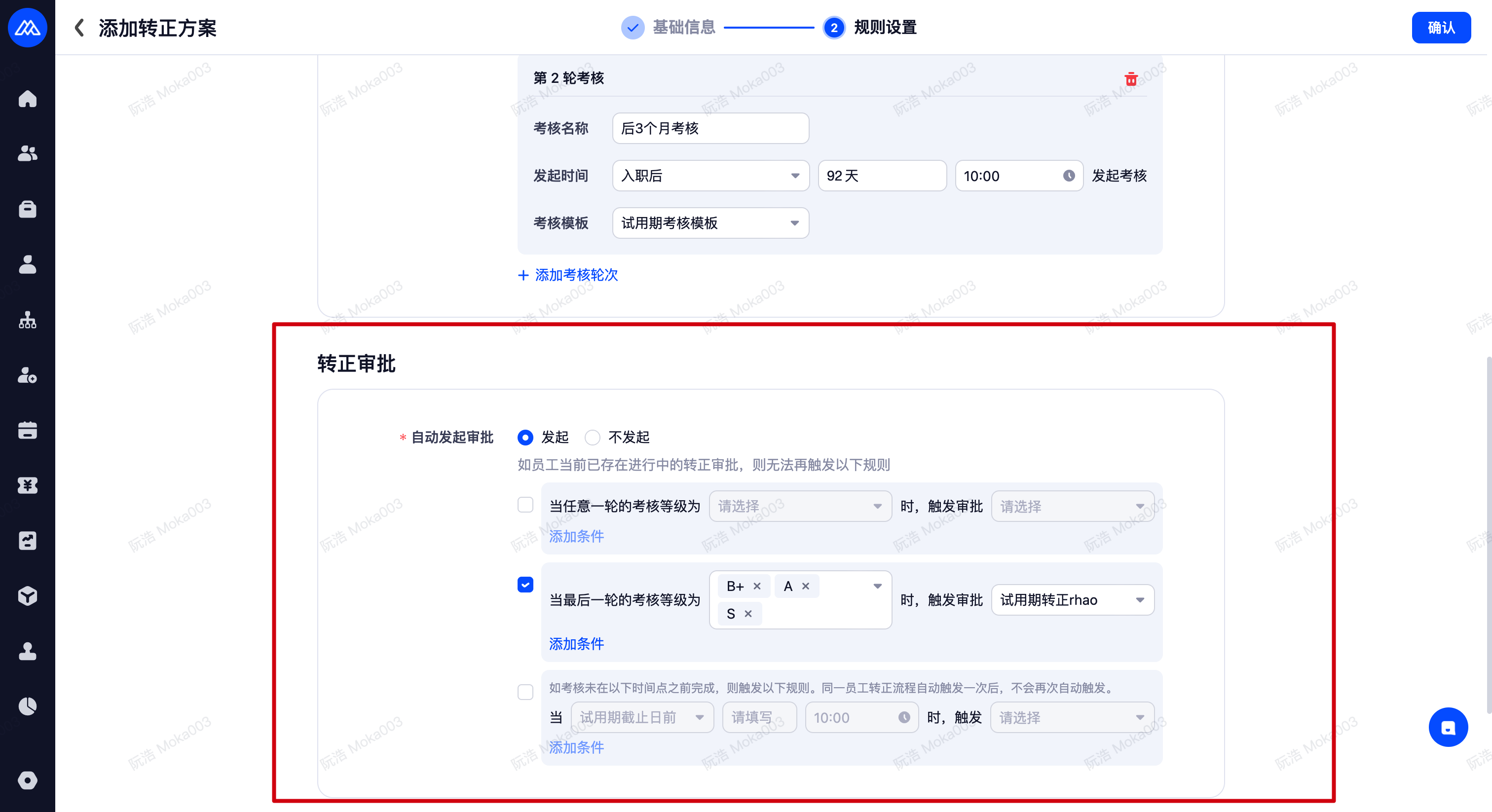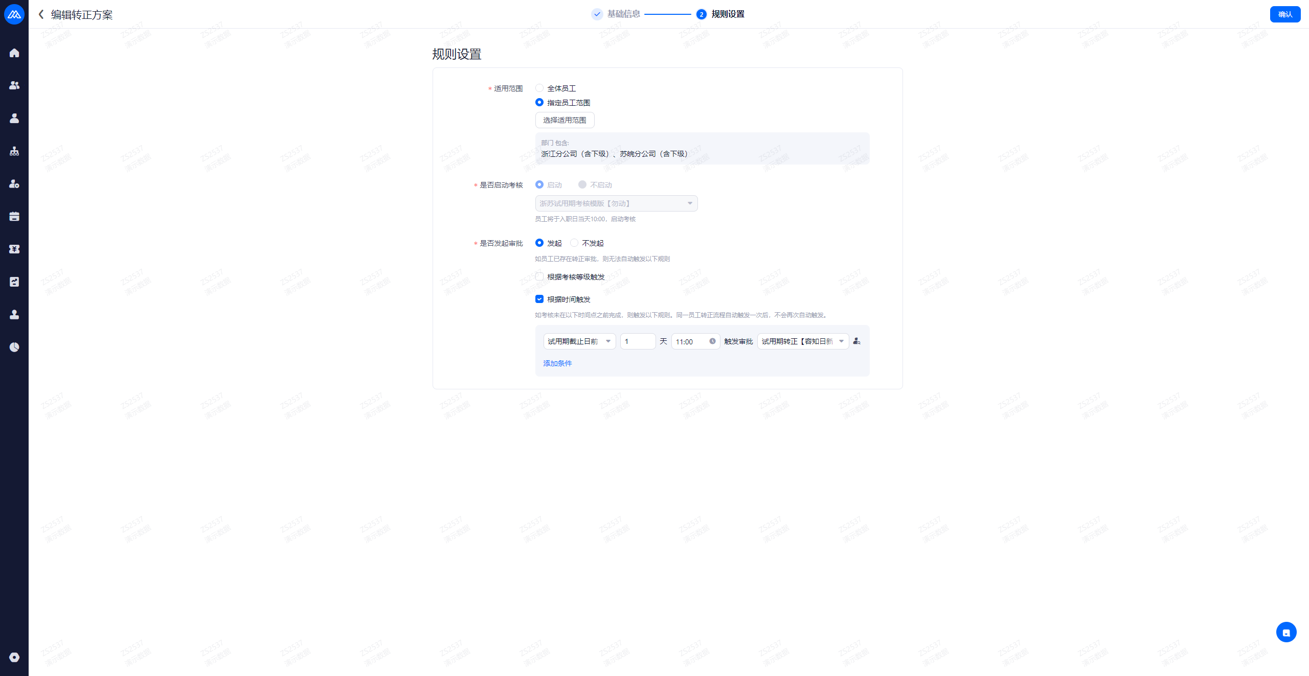 A:可以,可以设置试用转正方案,是否启用考核选择“不启用”,是否发起审批选择“发起”,发起方式选择“根据时间触发”,如下图所示: