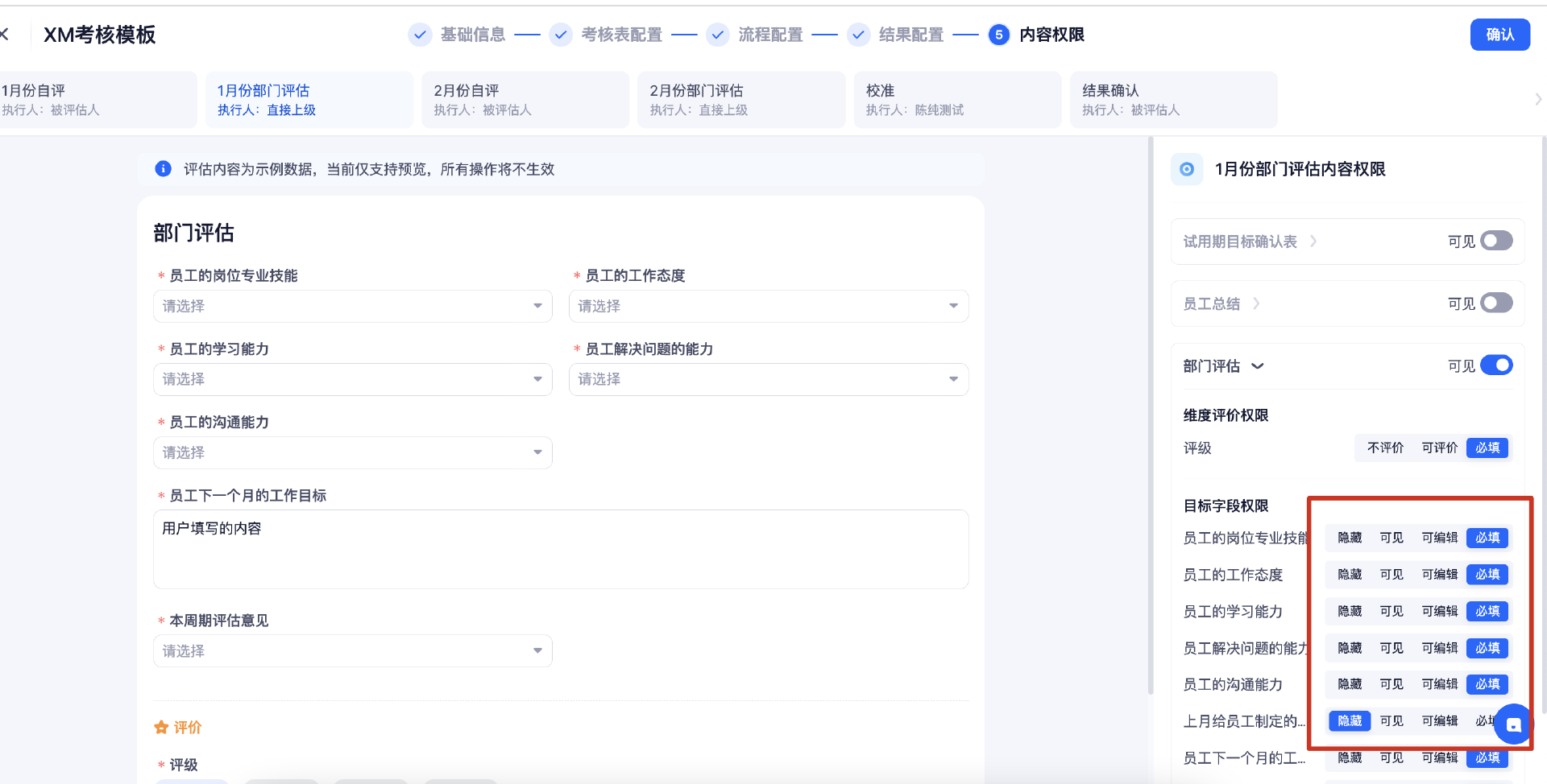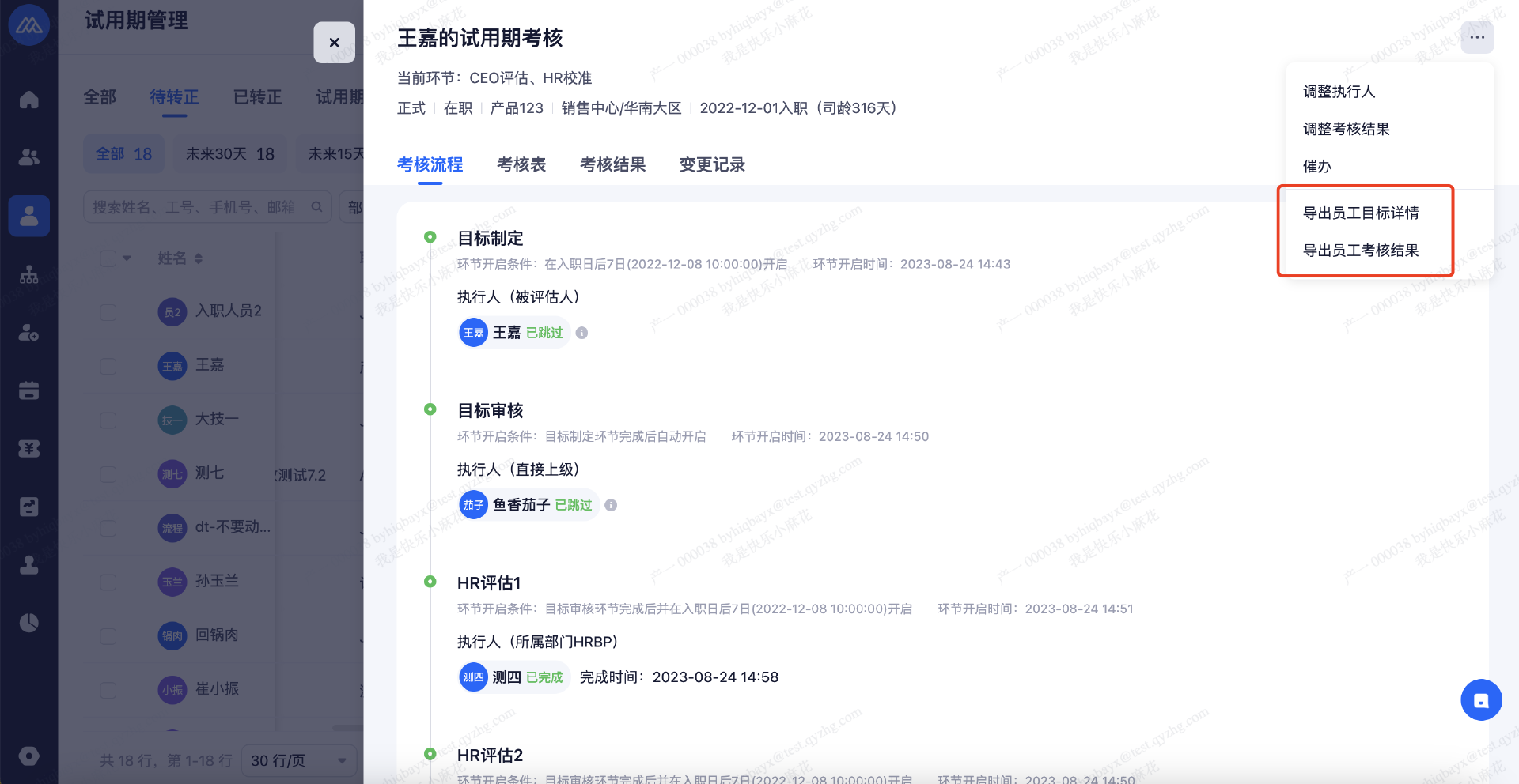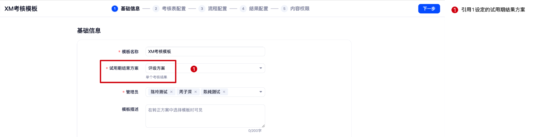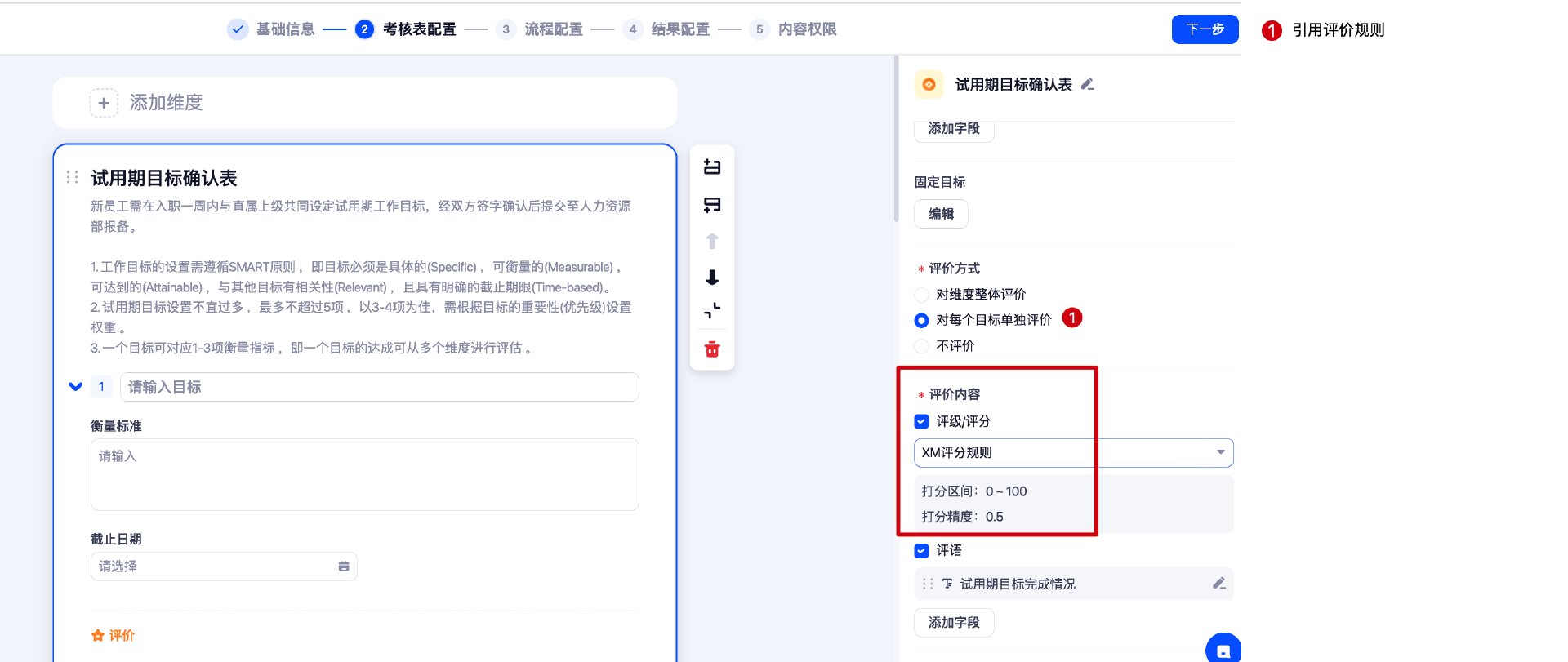 试用期考核复用了绩效考核的底层能力,支持配置试用期考核的考核表、考核流程、考核结果、各节点内容权限等。如下