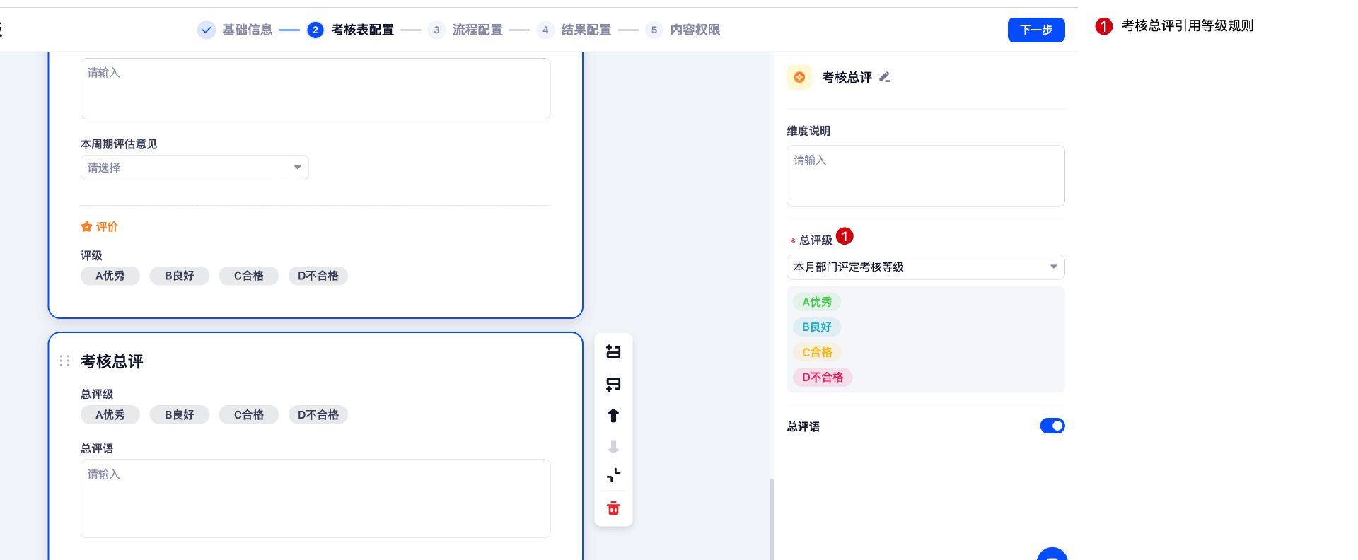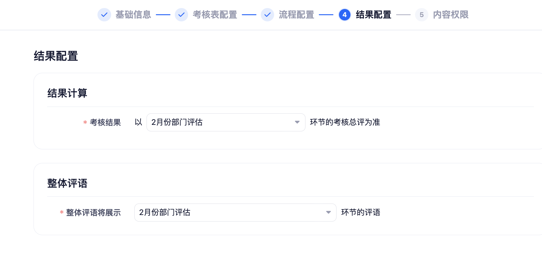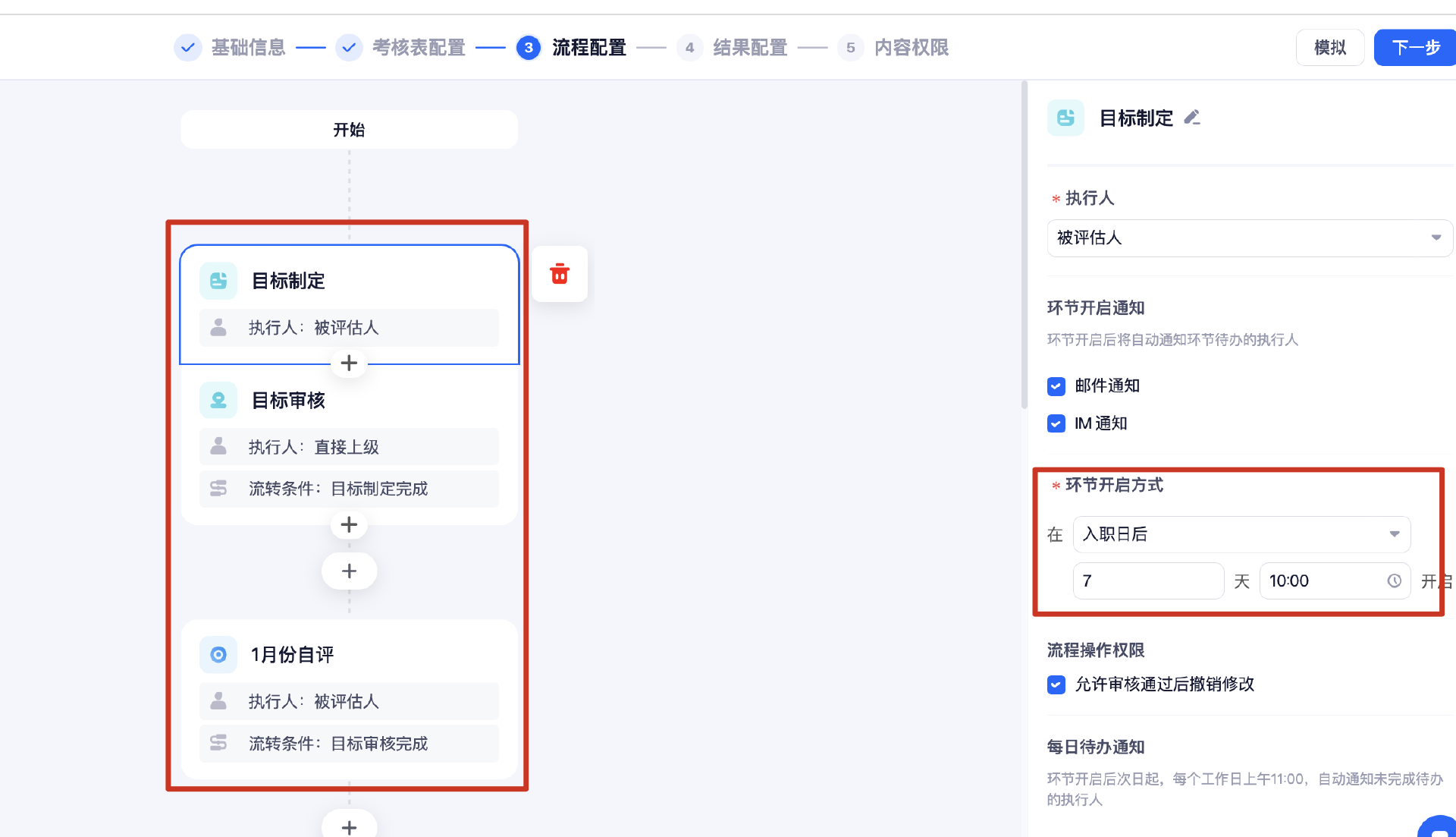 试用期考核复用了绩效考核的底层能力,支持配置试用期考核的考核表、考核流程、考核结果、各节点内容权限等。如下