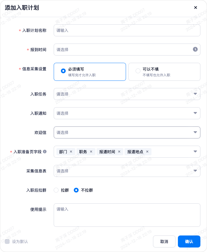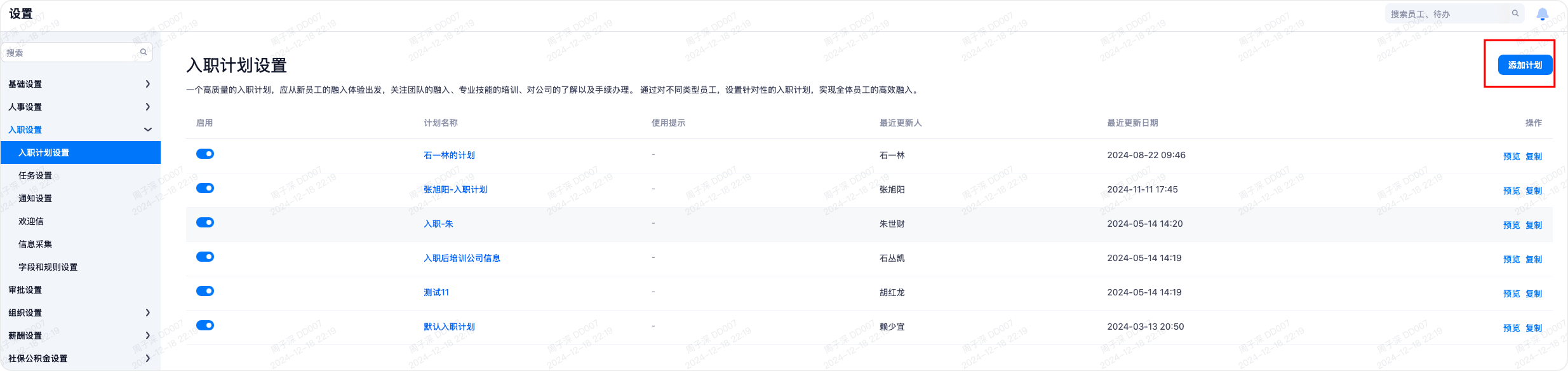 | 路径:设置-入职设置-入职计划设置 操作步骤:点击添加计划,填写相关必填信息。