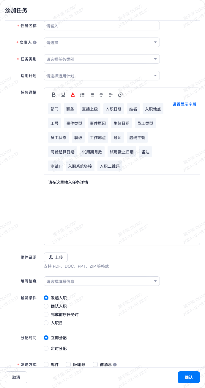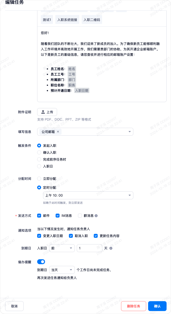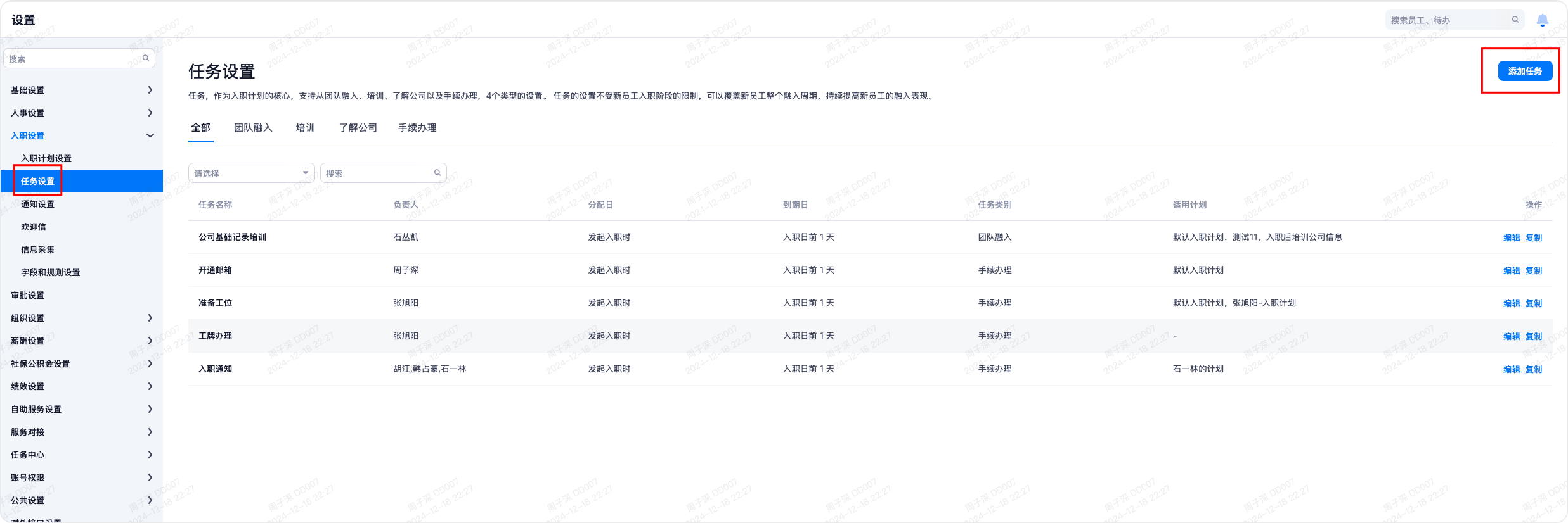 | 路径:设置-入职设置-任务设置 操作步骤:点击添加任务,填写相关必填信息。