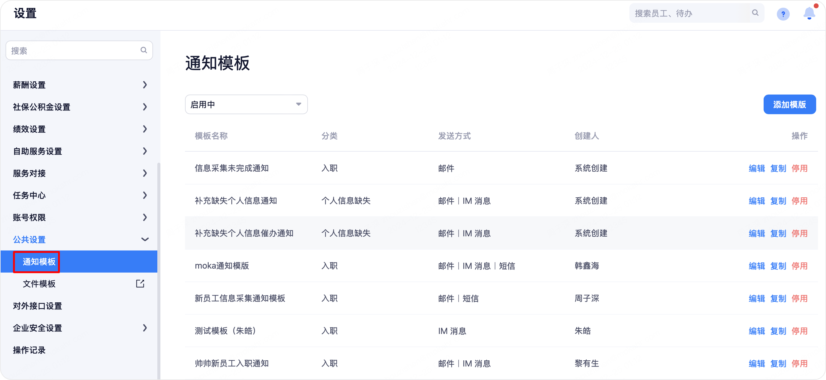 需要系统通知什么内容,前提是先有通知模板。在设置-公共设置-通知模板右上角点击添加模板,新建一个通知模板。常见的通知有:新员工入职信息采集通知,通过此通知,邀请新员工完成信息采集。