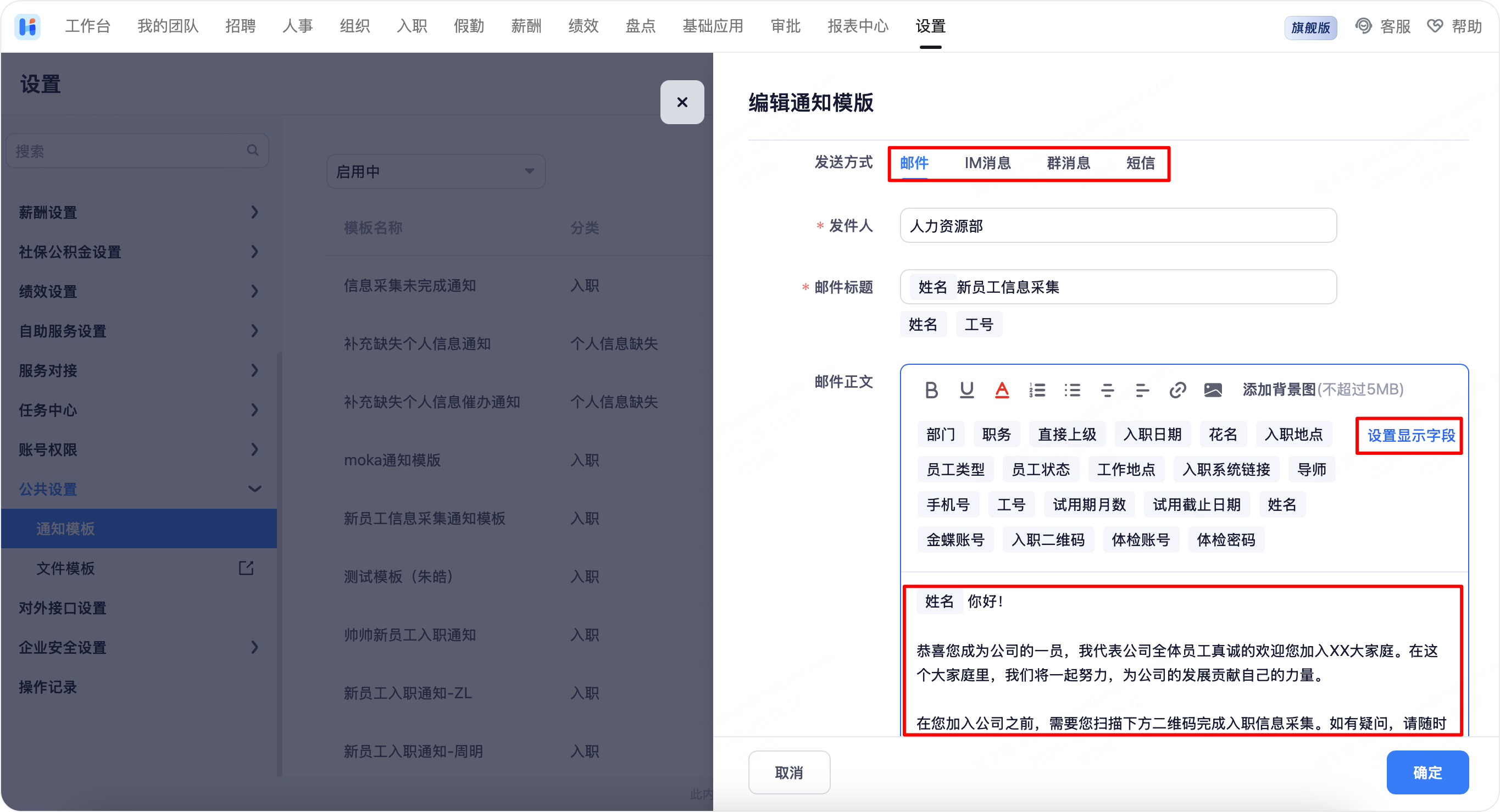 | 路径:设置-公共设置-通知模板 操作步骤:点击添加模板,填写相关必填信息。 发送方式:基于不同的发送方式,配置通知文案,如邮件通知,可嵌入入职信息采集二维码,短信通知可嵌入采集通知链接。 发件人(邮件发件人):一般以公司名称或HR部门命名 邮件标题:支持嵌入员工姓名或工号。如【张三】入职欢迎信 正文:基于实际业务配置通知文案,支持引入系统变量 |