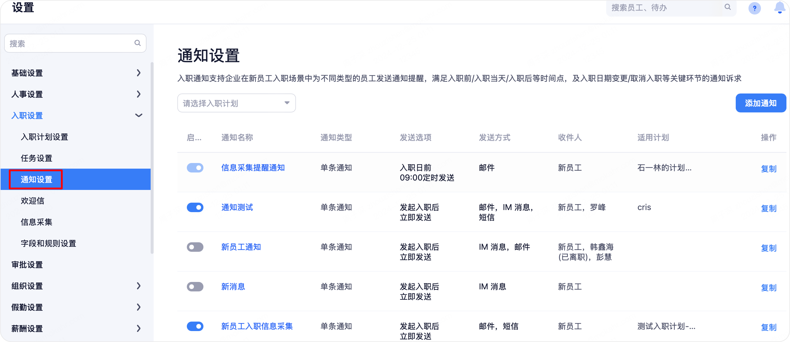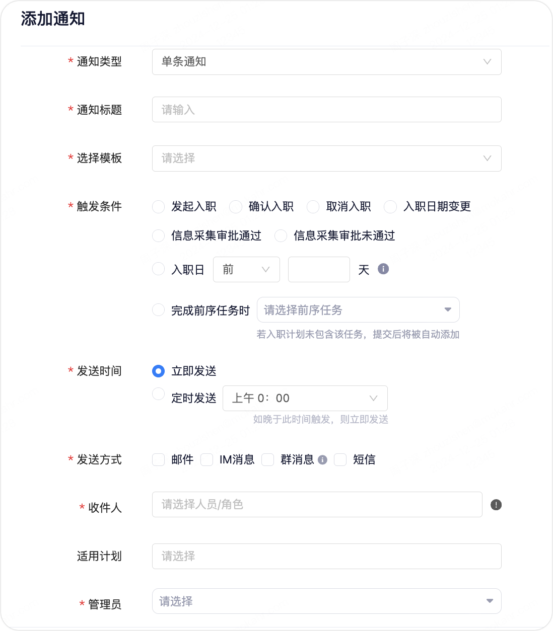 | 路径:设置-入职设置-通知设置 操作步骤:点击添加通知,填写相关必填信息。