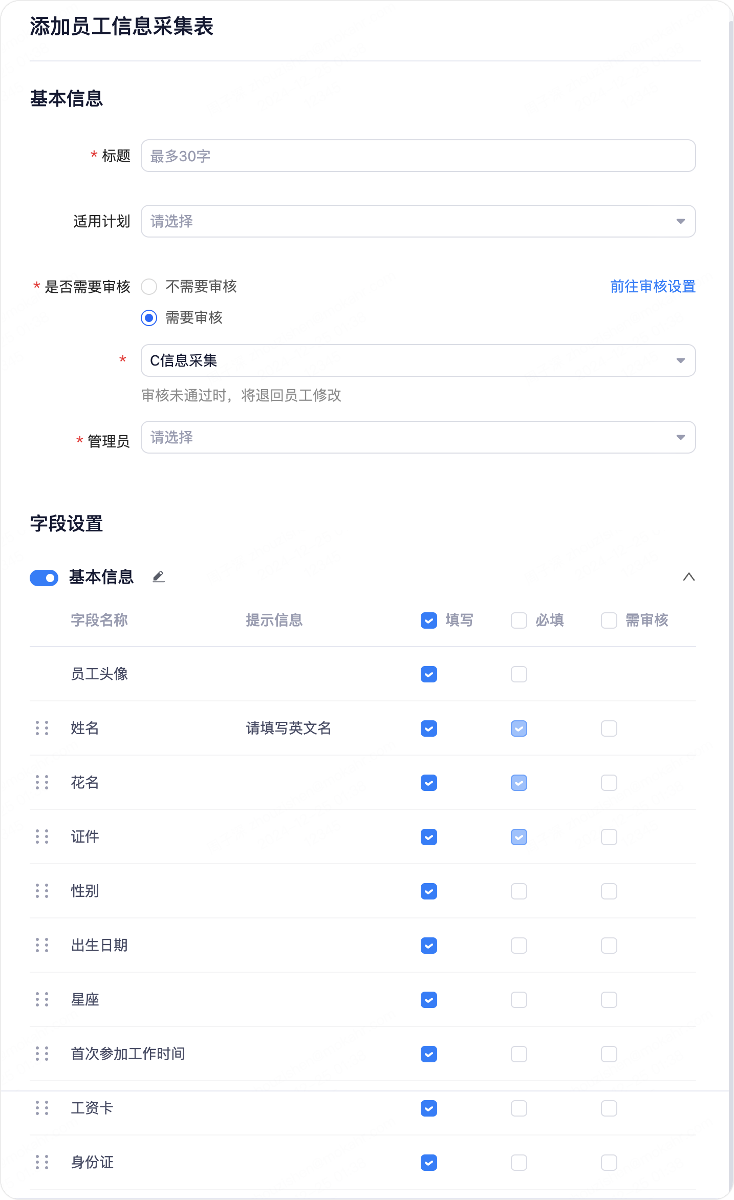 | 路径:设置-入职设置-信息采集 操作步骤:点击添加信息采集,填写相关必填信息。 标题:填写采集表标题名称 适用计划:选择Step1配置的入职计划 是否需要审核:员工通过入职信息采集通知二维码或链接提交信息后,是否需要选择审核,如需审核先配置审批流程,在此选择对应的流程(流程配置路径:设置-审批设置-新建 信息采集 类流程)。 管理员:配置当前采集表的管理员,只有管理员才可以管理此配置。 字段设置:按需勾选字段是否需要采集、是否必填、是否需要审核。(若字段不满足业务需求,请到设置人事设置-员工信息设置中配置) |