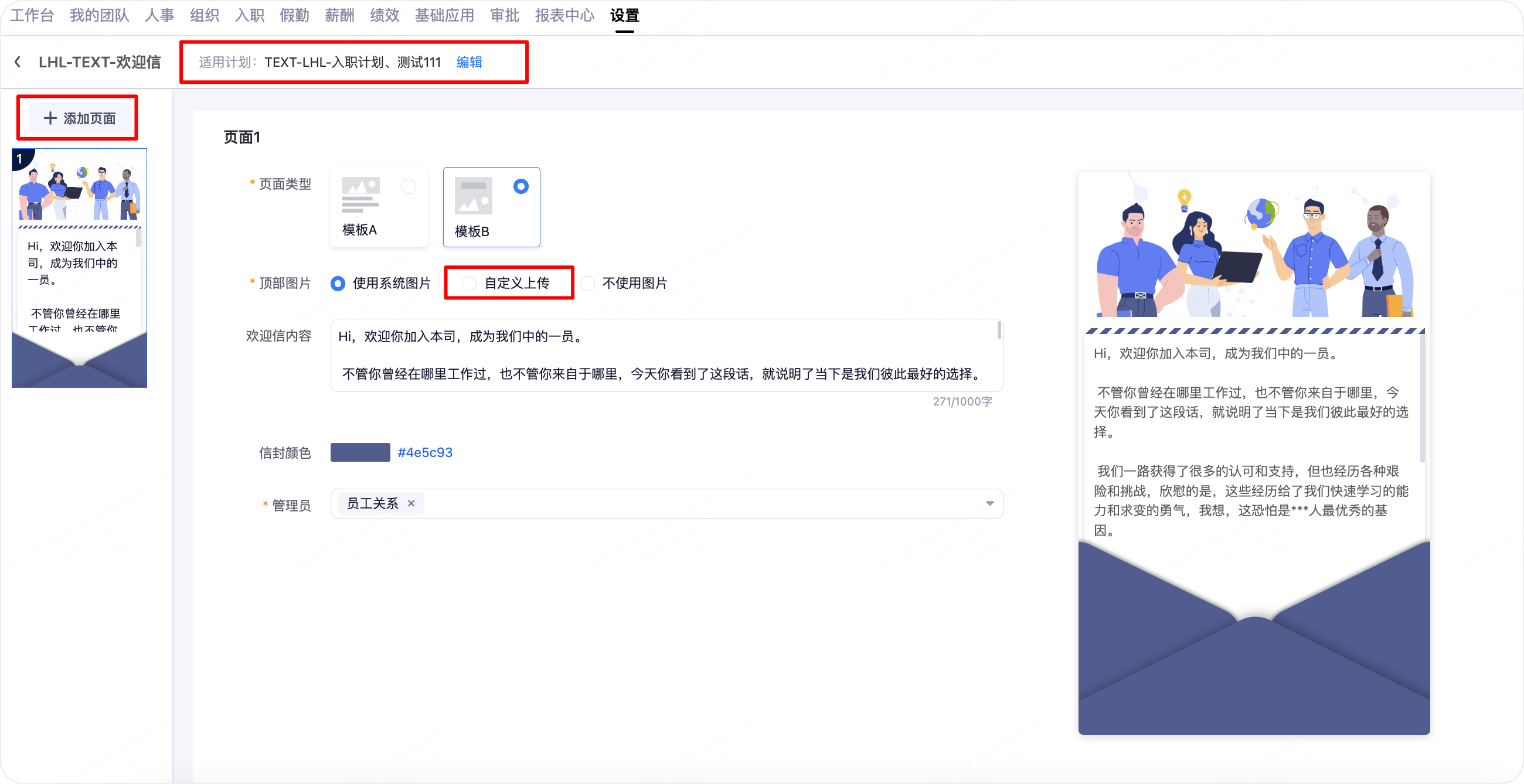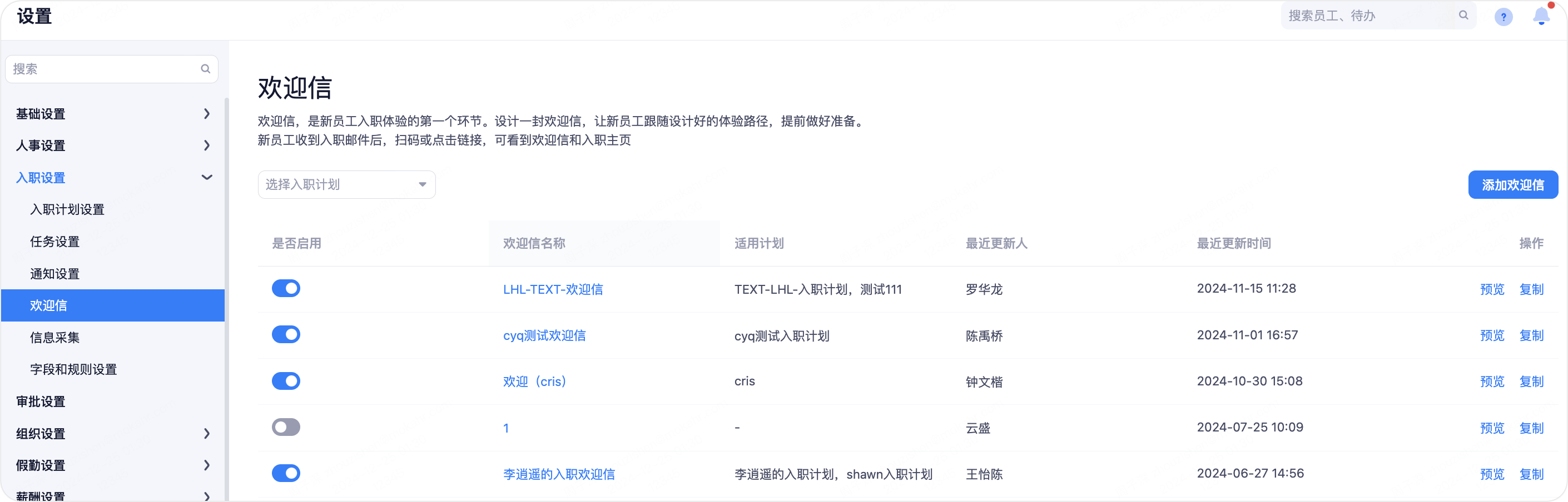 | 路径:设置-入职设置-欢迎信 操作步骤:点击添加欢迎信,填写相关必填信息。 适用计划:选择Step1配置的入职计划 页面数量配置:可自定义配置页面数量,如首页是入职欢迎,第二页是入职指引等 页面详情配置:选择系统预置的模板或者自定义上传入职欢迎指引。 管理员:配置当前欢迎信的管理员,只有管理员才可以管理此配置。 |