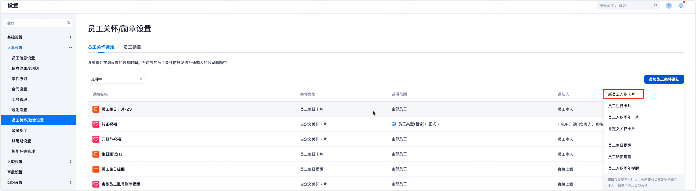| 路径:设置- 人事设置-员工关怀/勋章设置 操作步骤:点击添加员工关怀通知,填写相关必填信息。 通知名称:填写欢迎卡片的通知名称,如 全员入职欢迎卡片 适用范围:自定义配置该卡片作用员工,如 A 公司一个卡片,B 公司一个卡片 谁会收到:配置卡片收件人 卡片配置:系统有预置模板,可自行选择配置。也可按要求设置具有企业特色的图片进行上传。 右侧可直接预览配置效果: