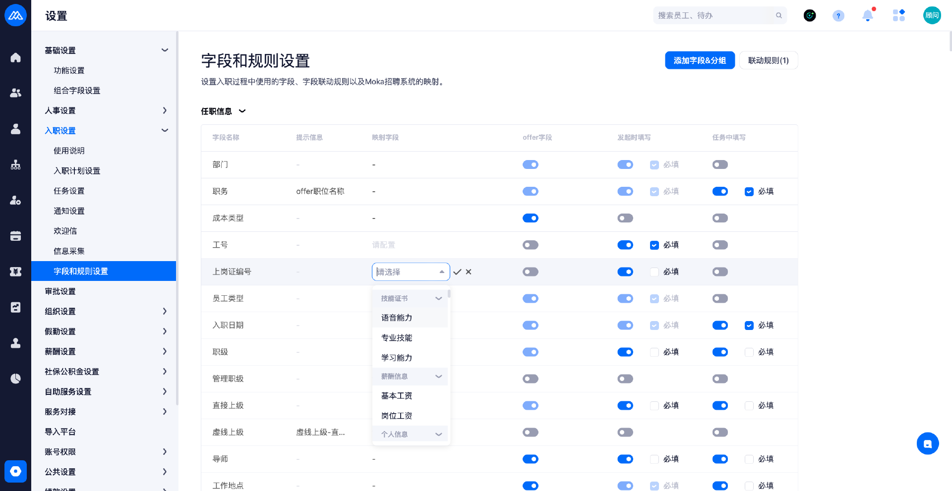 管理员可以在「字段和规则设置」设置 Moka 招聘系统和 Moka People 的字段映射关系,有映射关系的字段在发起入职时会自动从 Moka 招聘系统取数据