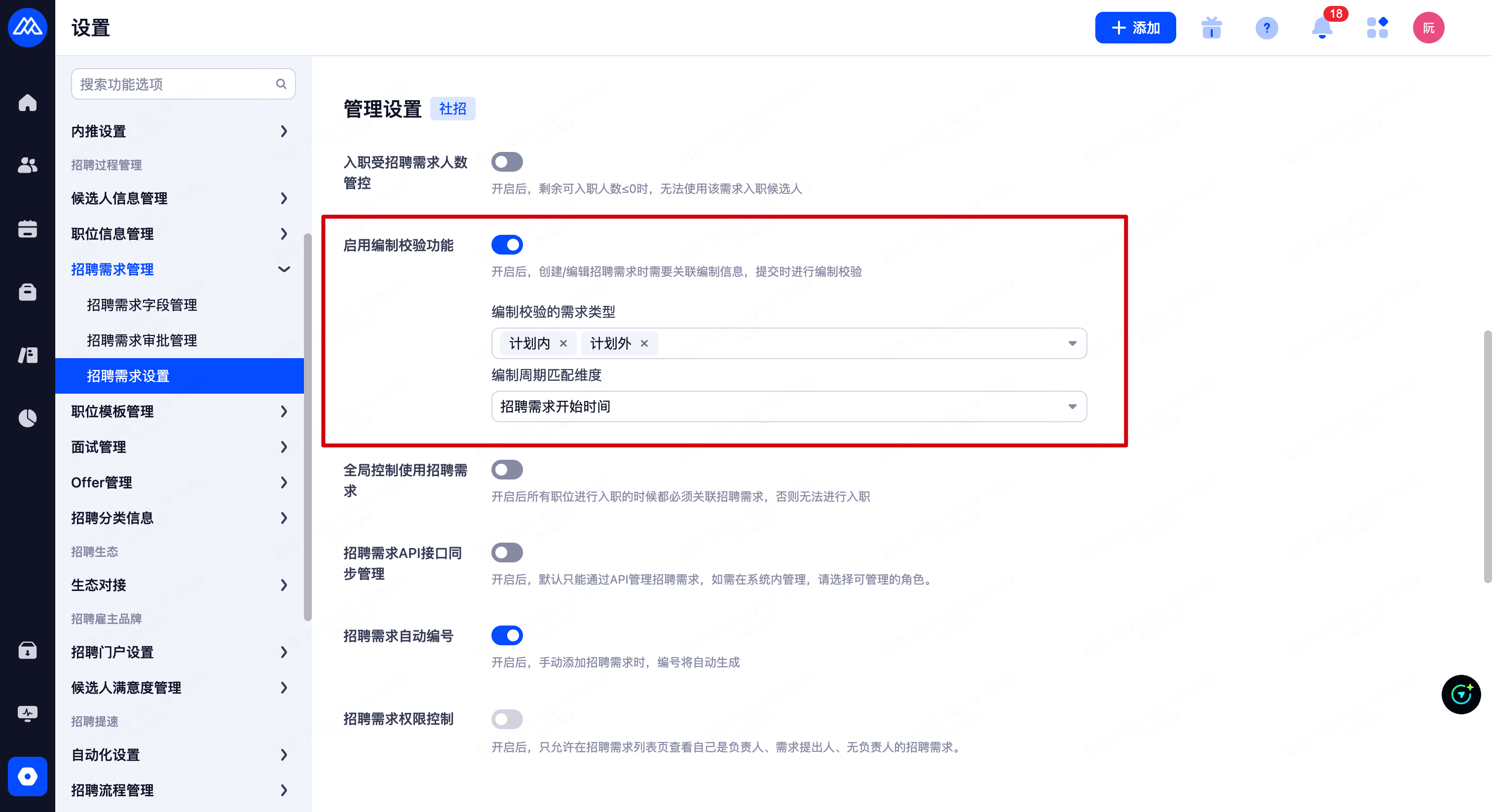系统路径:设置-招聘需求管理-招聘需求设置-管理设置-启用编制校验功能,如下图所示