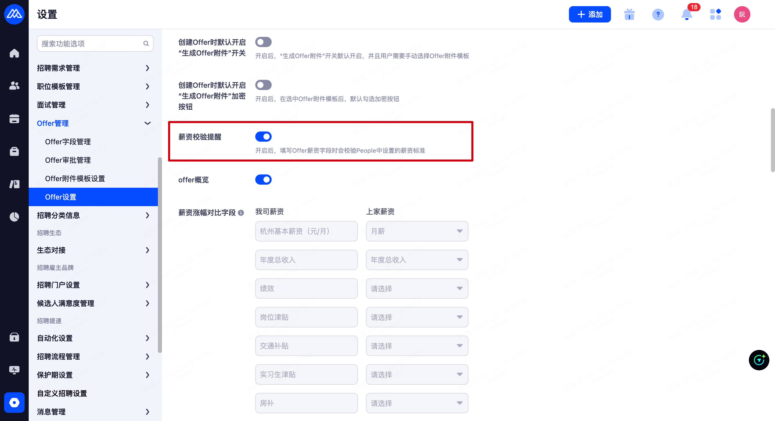 系统路径:设置-Offer管理-Offer设置-薪资校验提醒,如下图所示