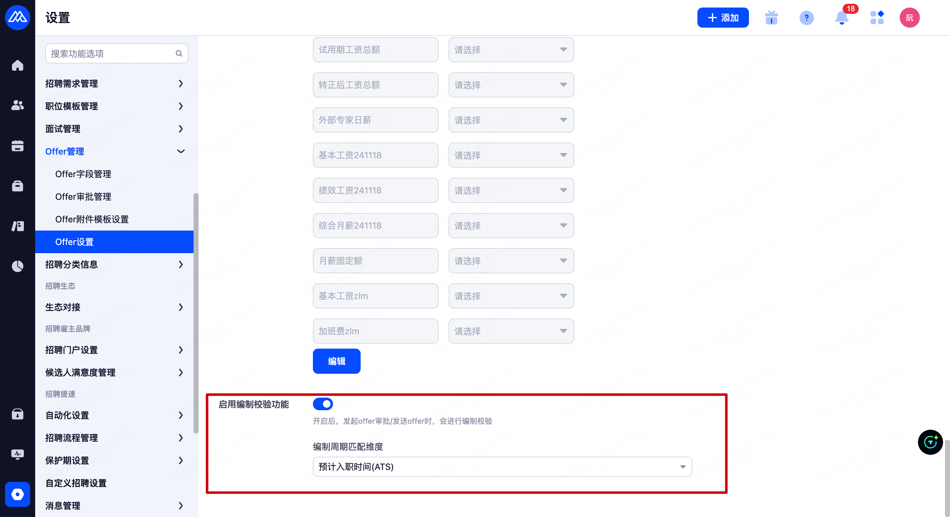 系统路径:设置-Offer管理-Offer设置-启用编制校验功能,如下图所示