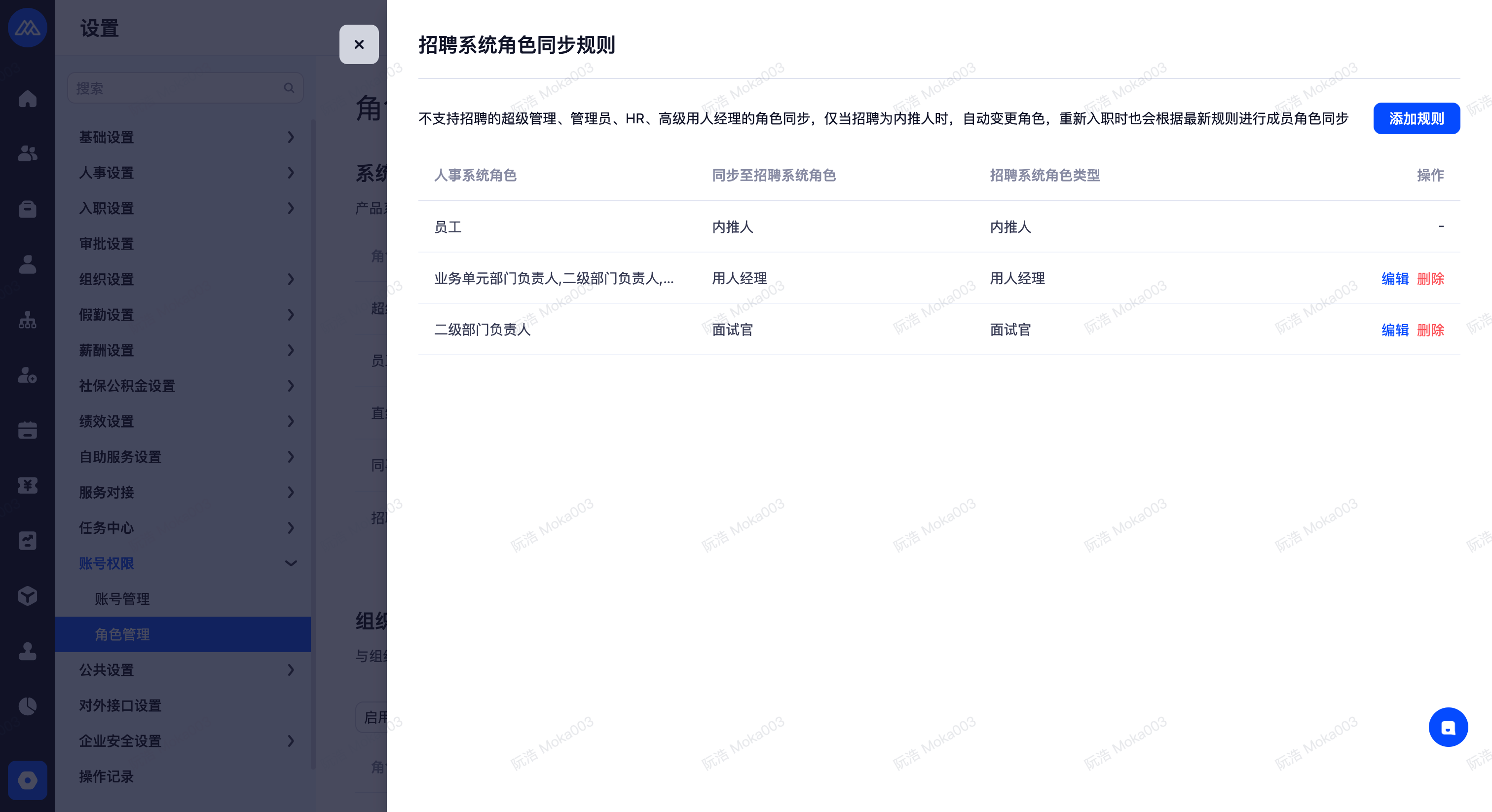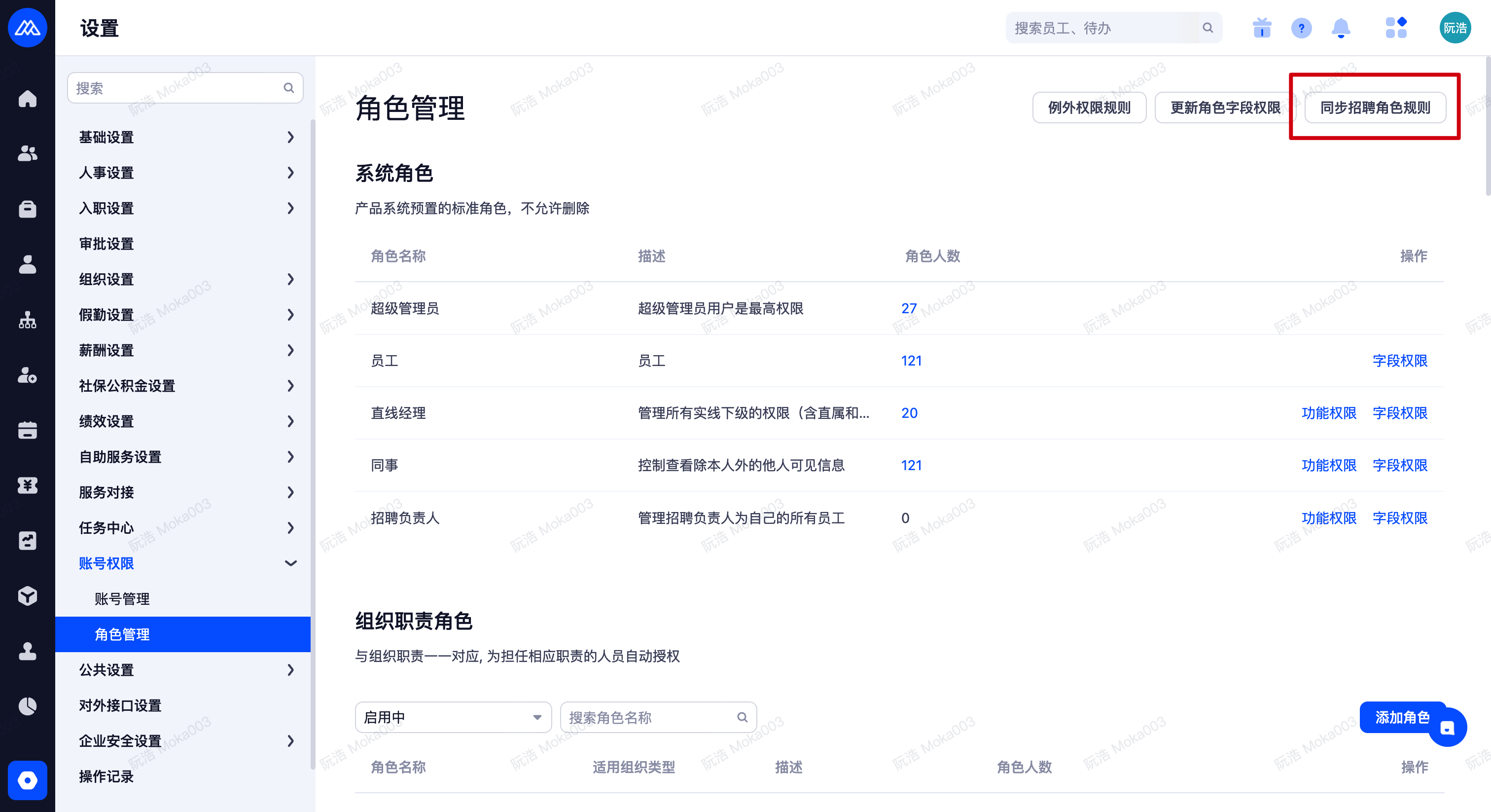 系统路径:设置-账号权限-角色管理-同步招聘角色规则,如下图所示