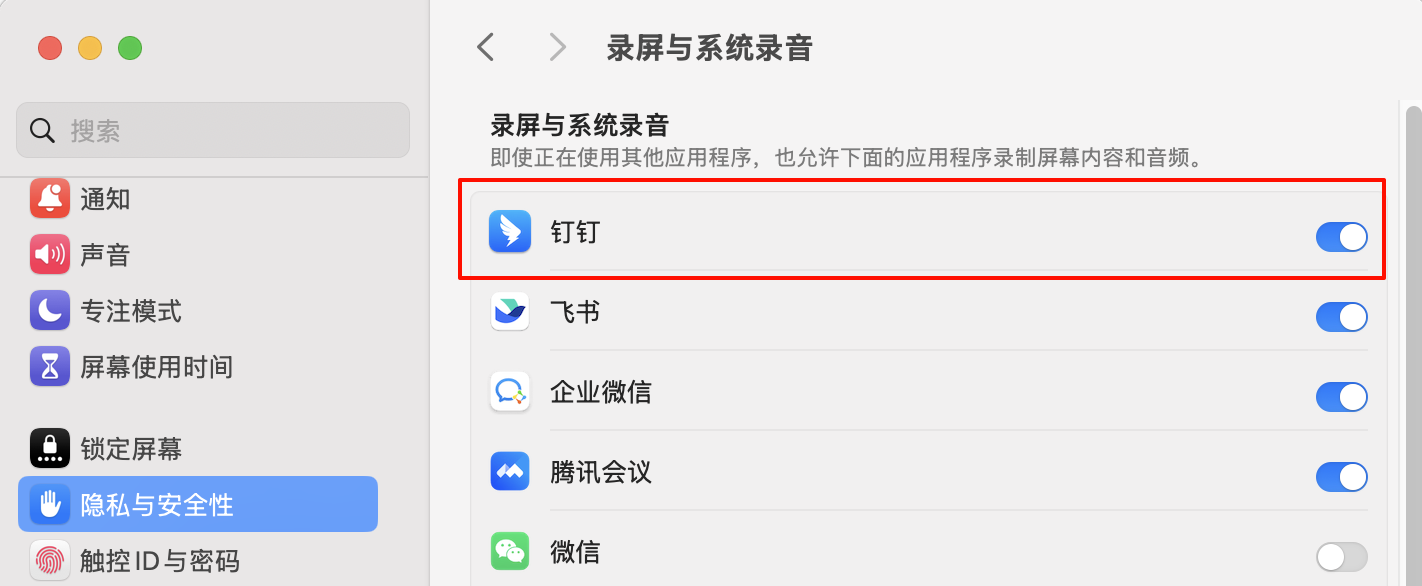 Mac系统在「设置-隐私与安全性-录屏与系统录音」中开启钉钉的权限