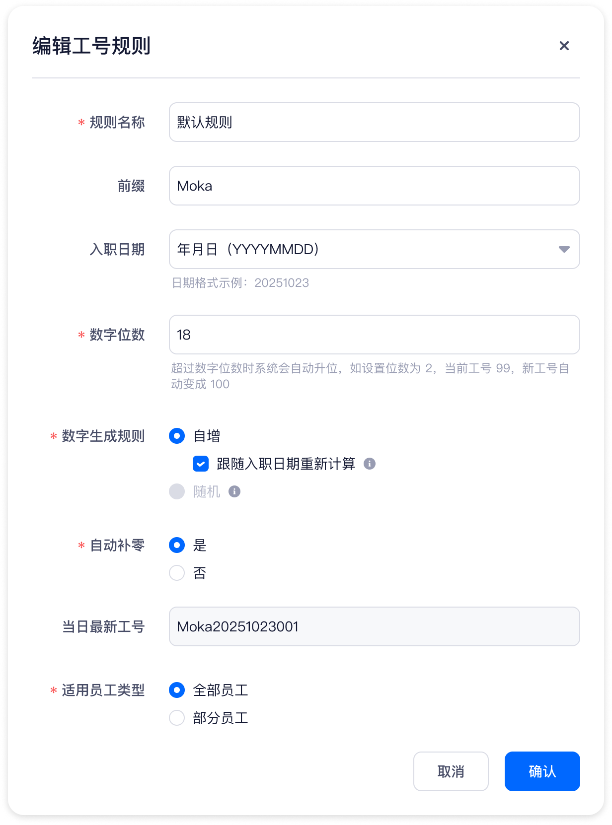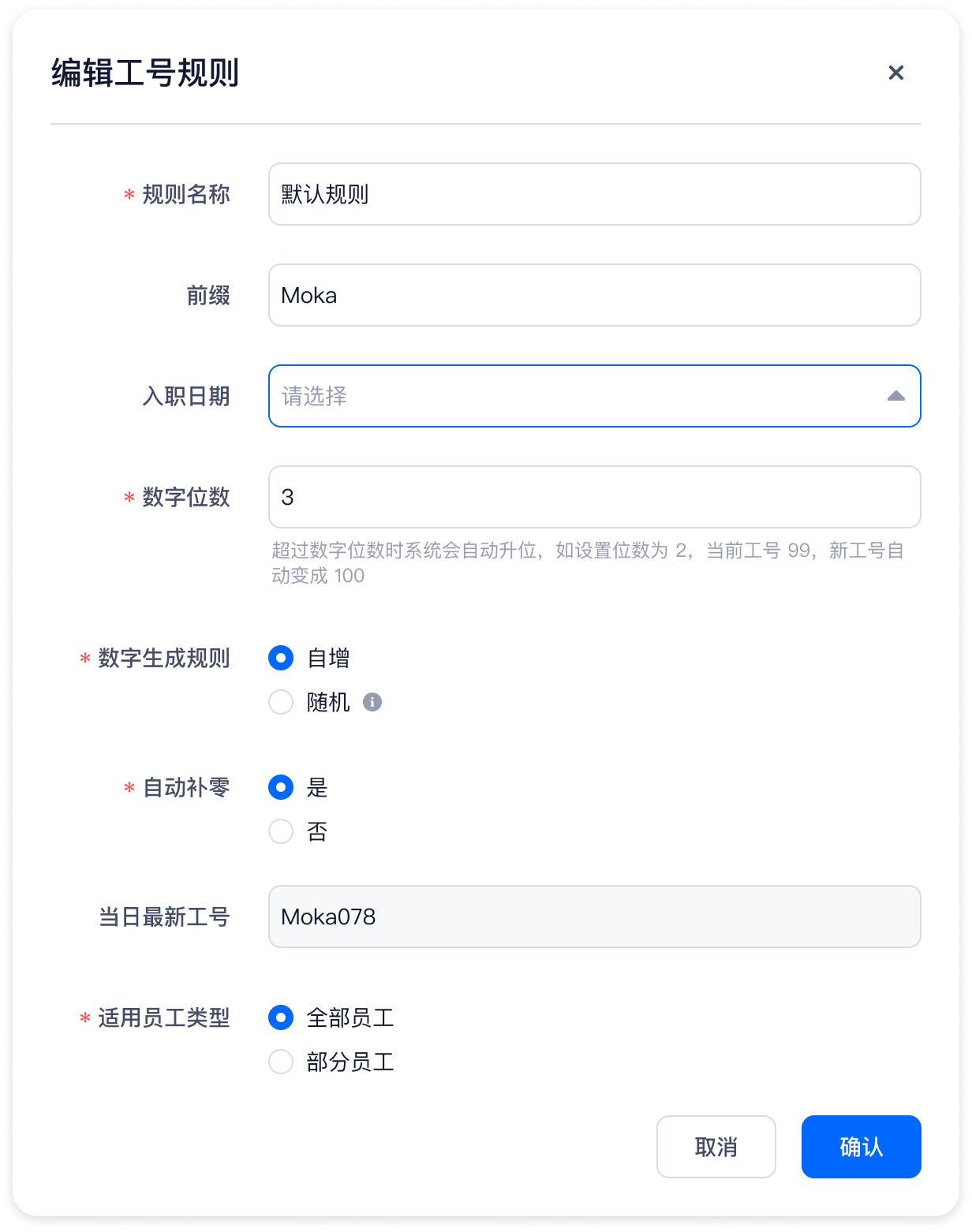 选择了入职日期后,数字仅支持自增,默认勾选【随入职日期重新生成】