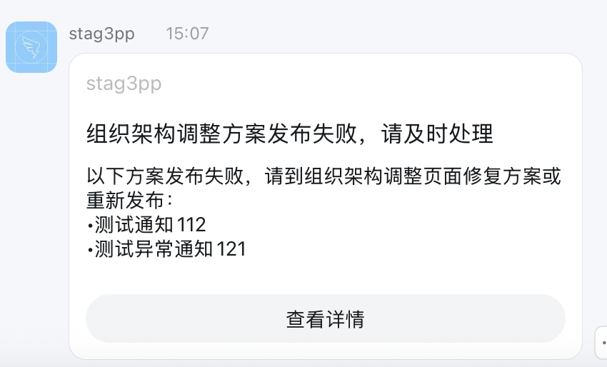 通知内容:以下方案发布失败,请到组织架构调整页面修复方案或重新发布
