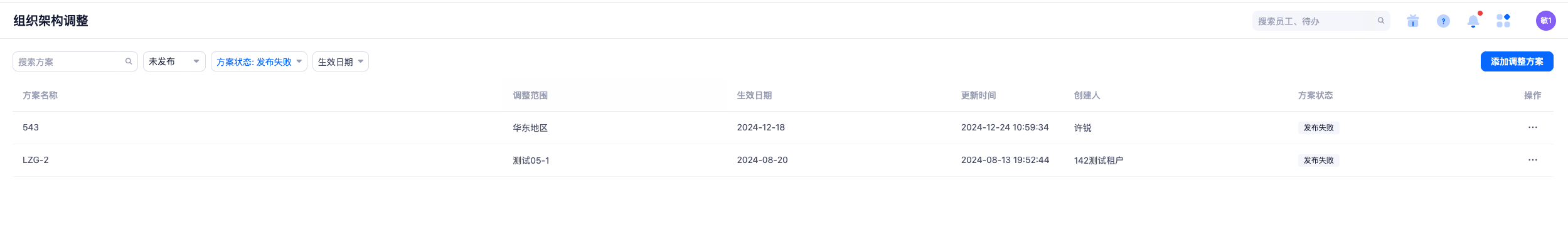 链接详情:跳转至组织架构调整列表,并定位到方案状态:发布失败