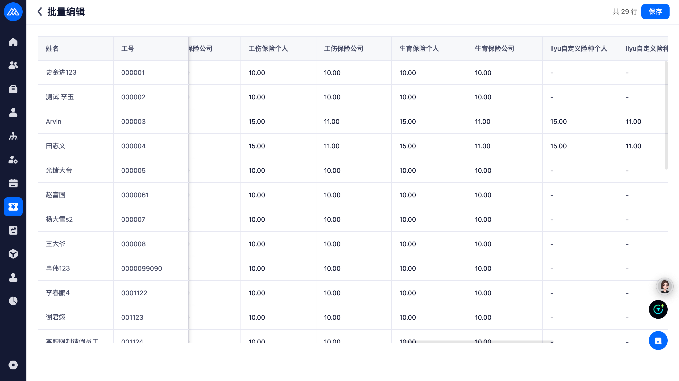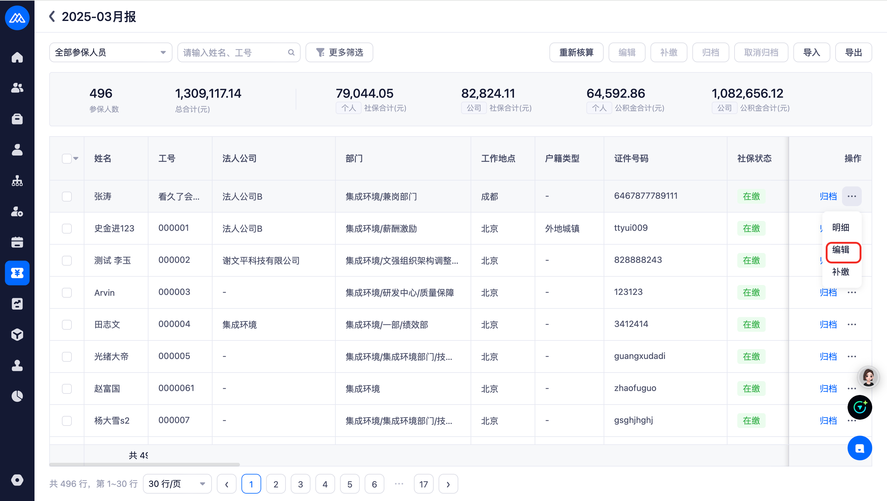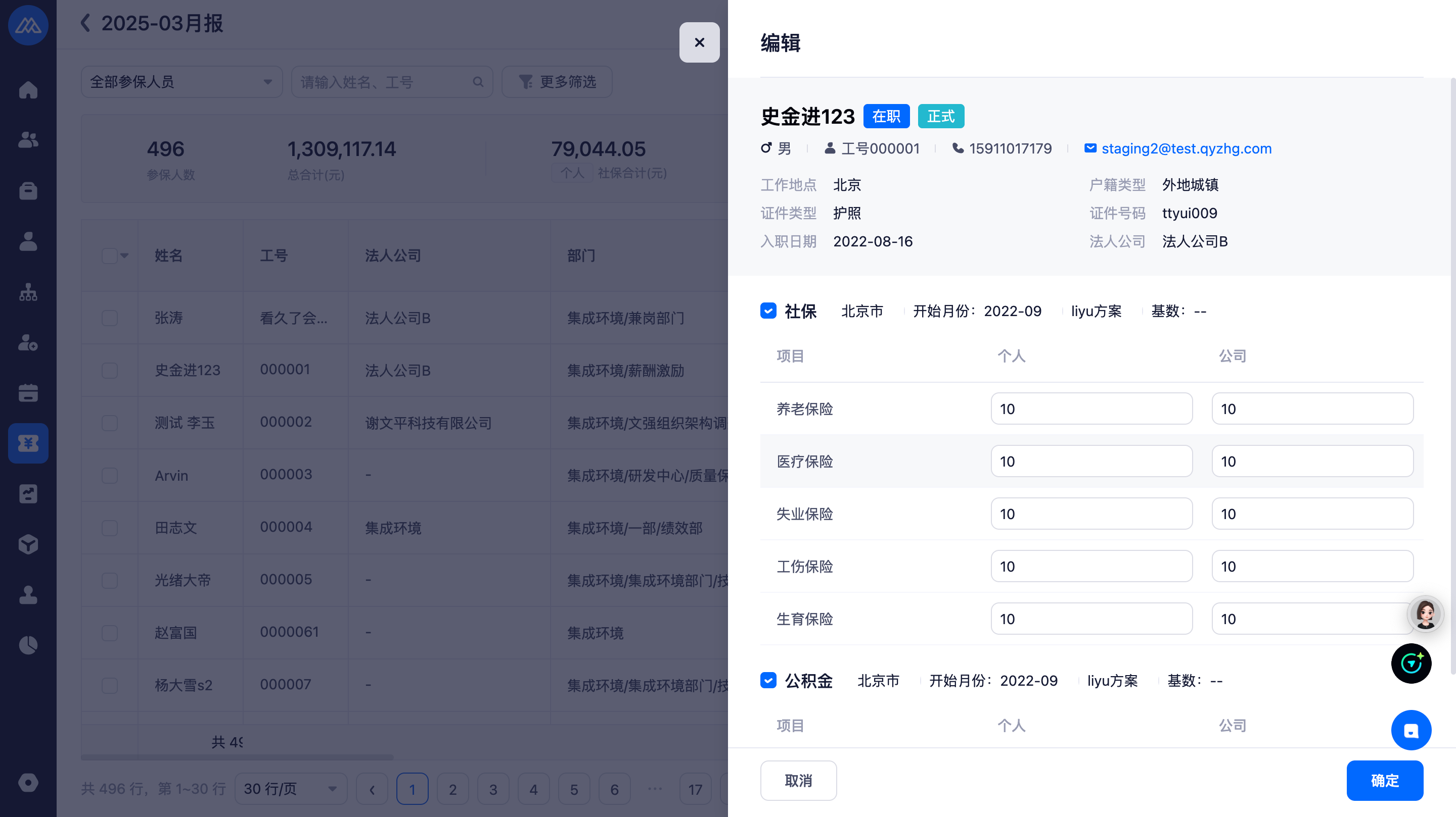 单行数据点击【编辑】后打开抽屉,支持直接修改社保及公积金数据