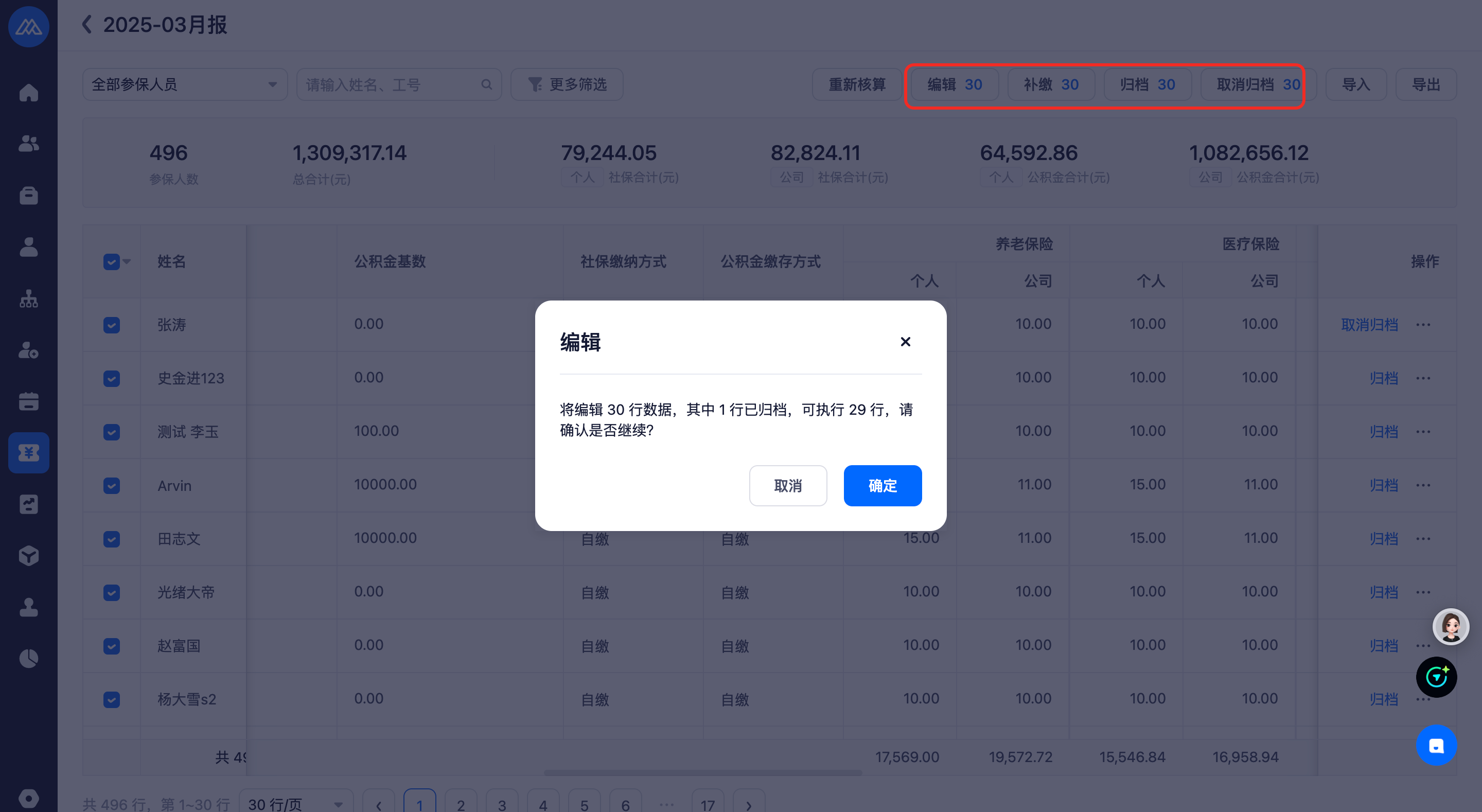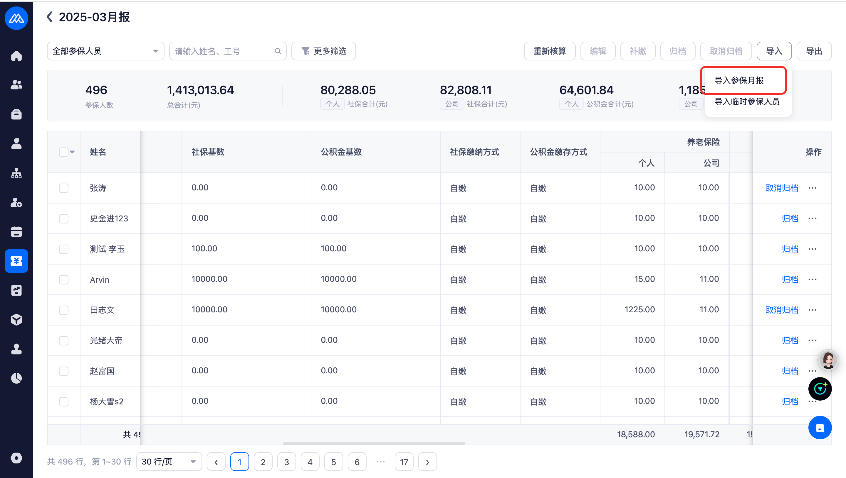注意:编辑与导入参保月报的数据,若数据未归档,操作重新核算参保月报均会更新为系统计算值