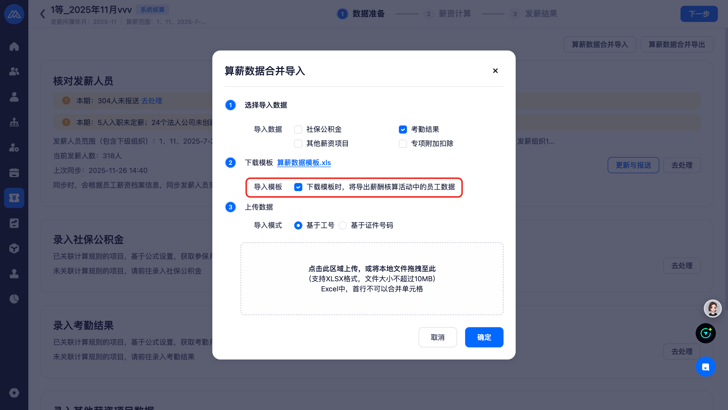 算薪数据合并导入,也同步需要支持客户选择是否导出薪酬核算活动中的员工数据