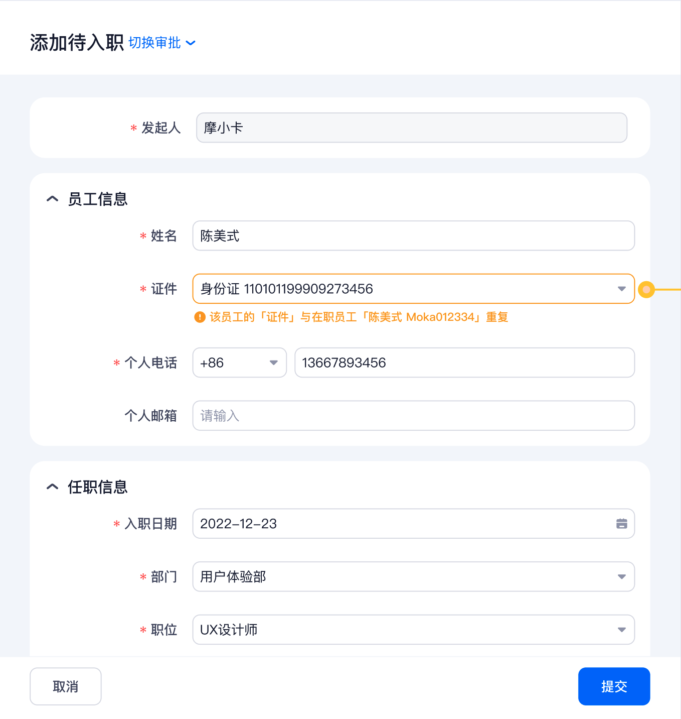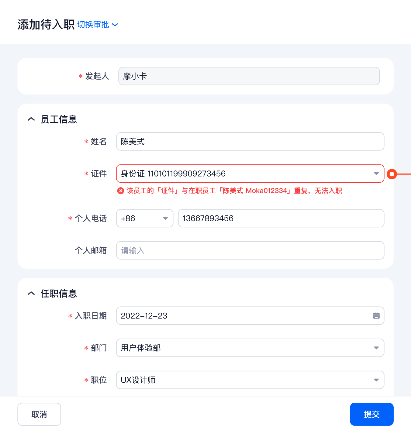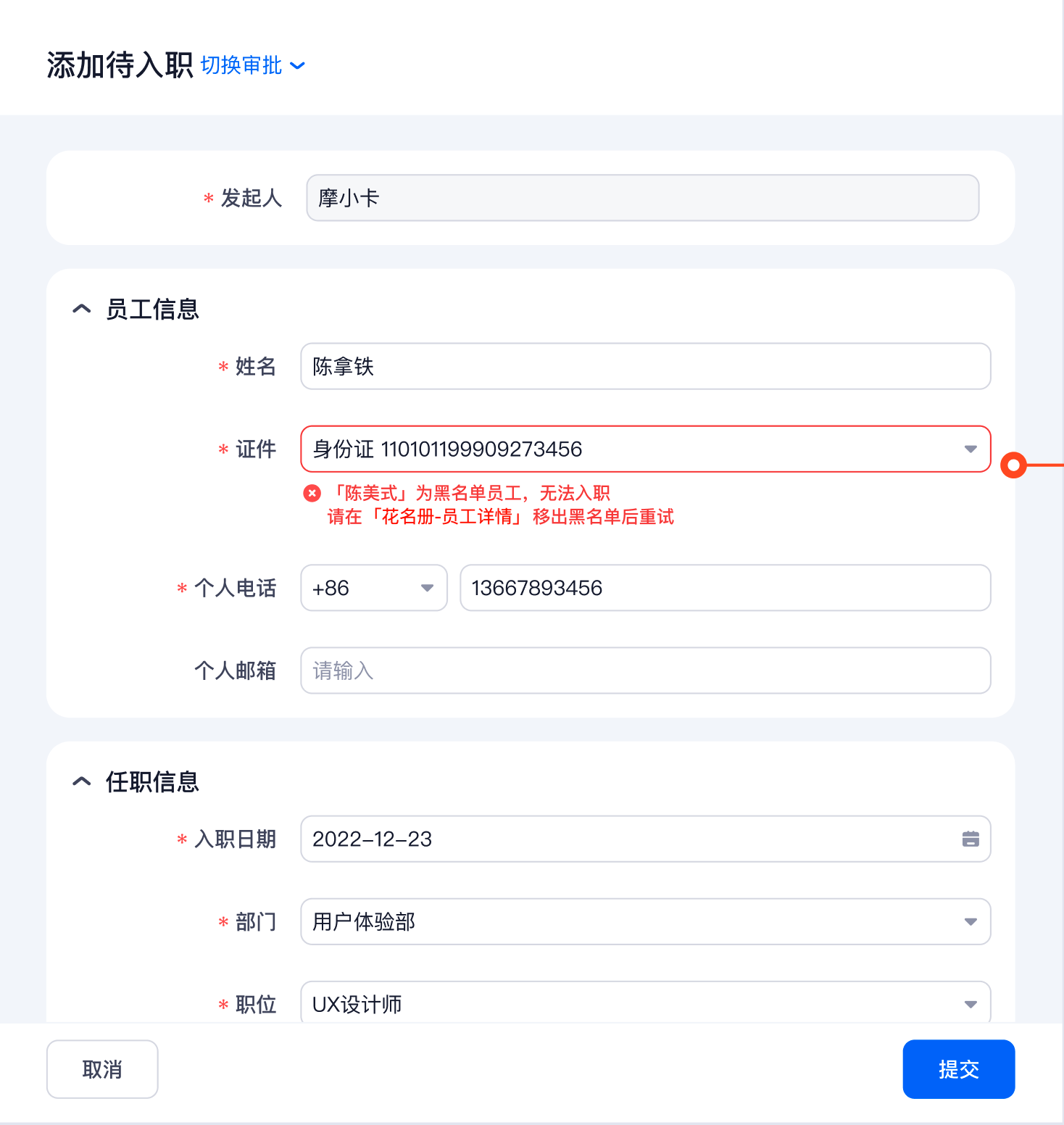 选择「校验后提醒」,则在添加待入职审批、扫码入职处报错提示,阻断提交
