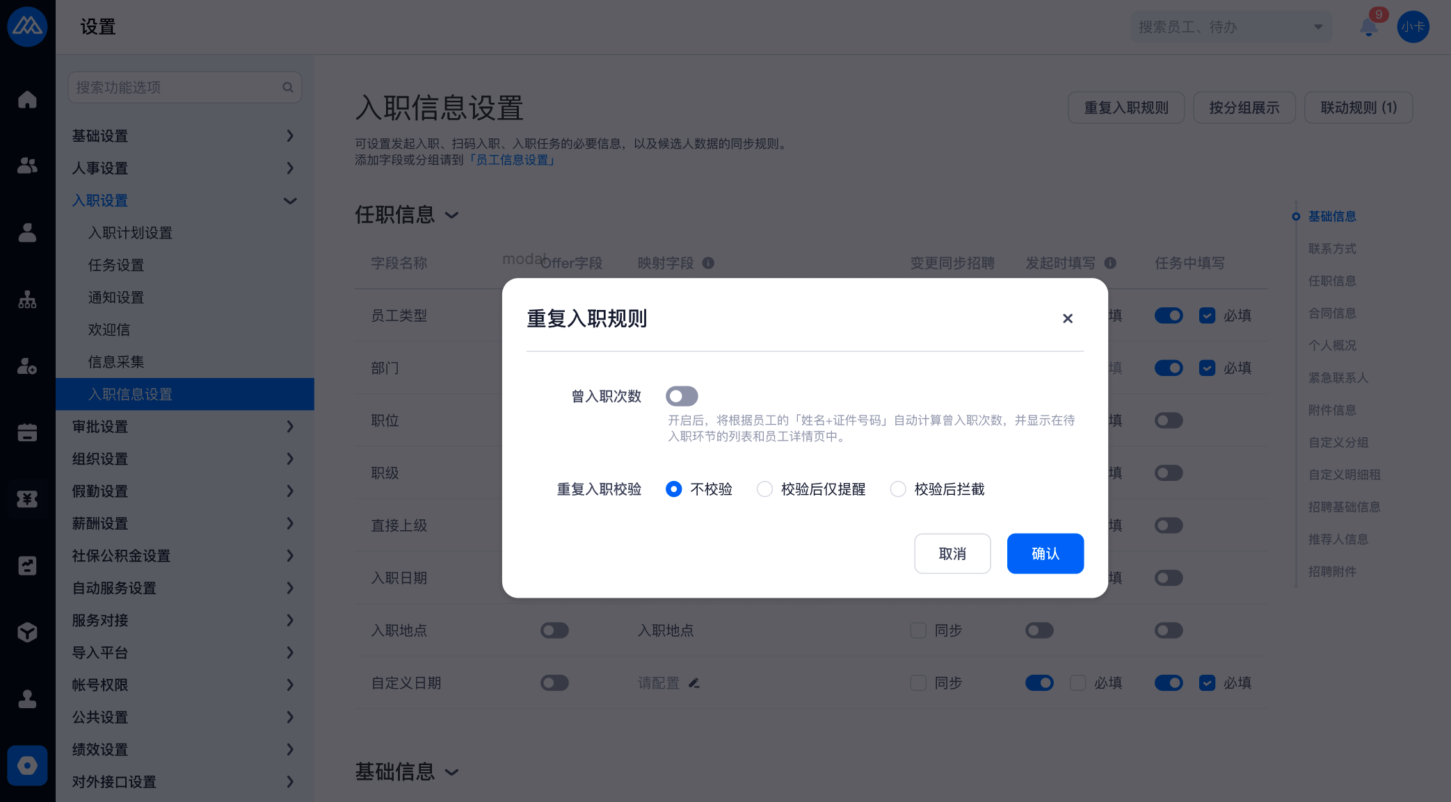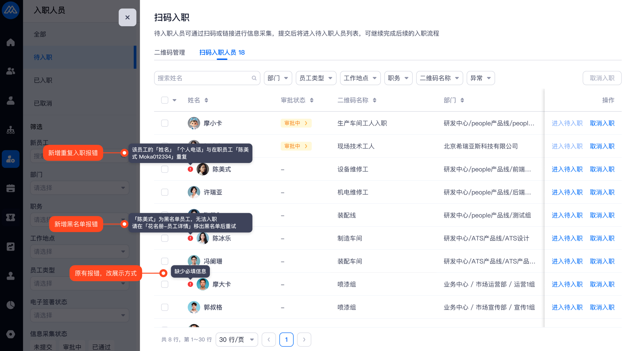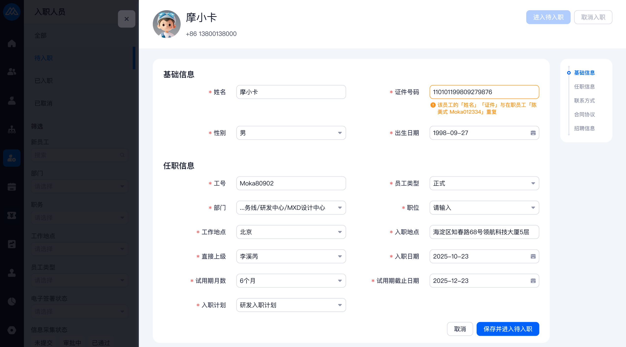选择「校验后提醒」,则在添加待入职审批、扫码入职处报错提示,阻断提交